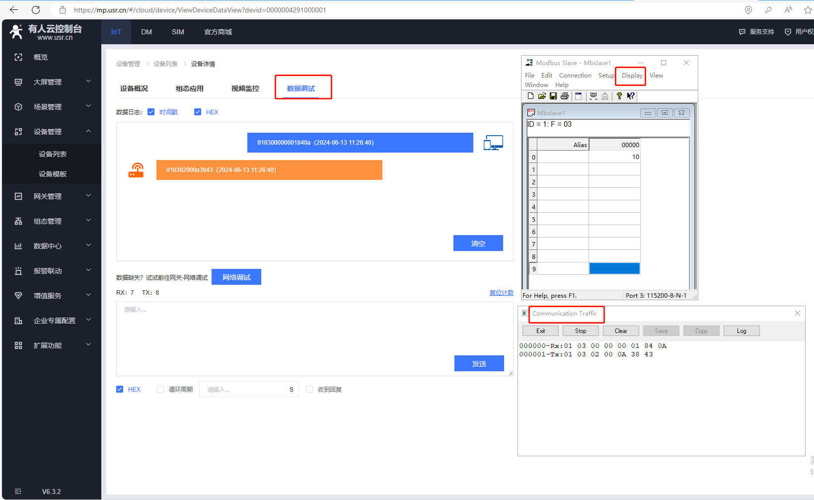 還可以利用有人云的數據調試功能,查看有人云的數據收發是否正常。