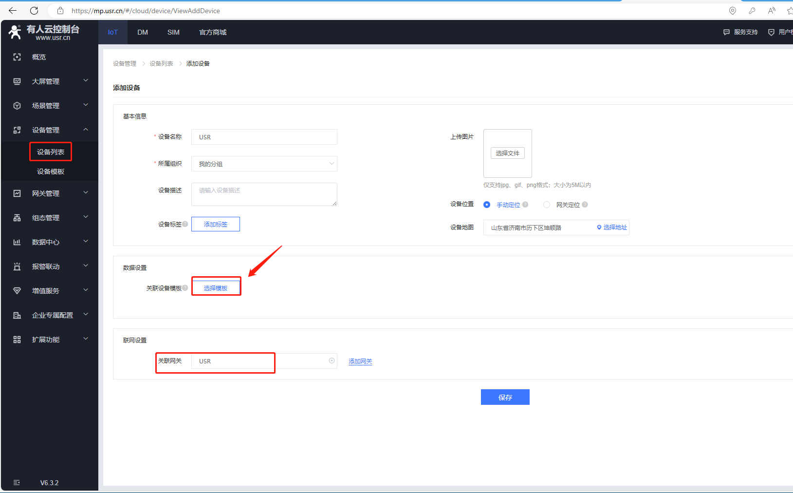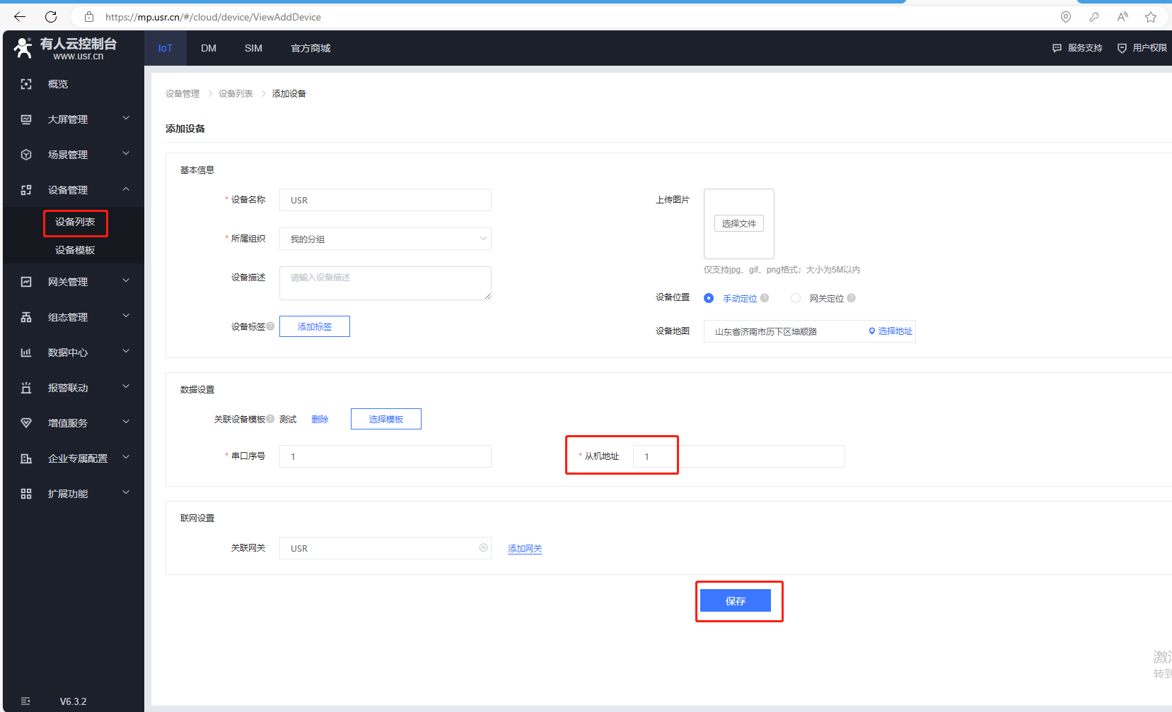聯網設置,關聯網關選擇自身設備,USR,最后點擊保存。