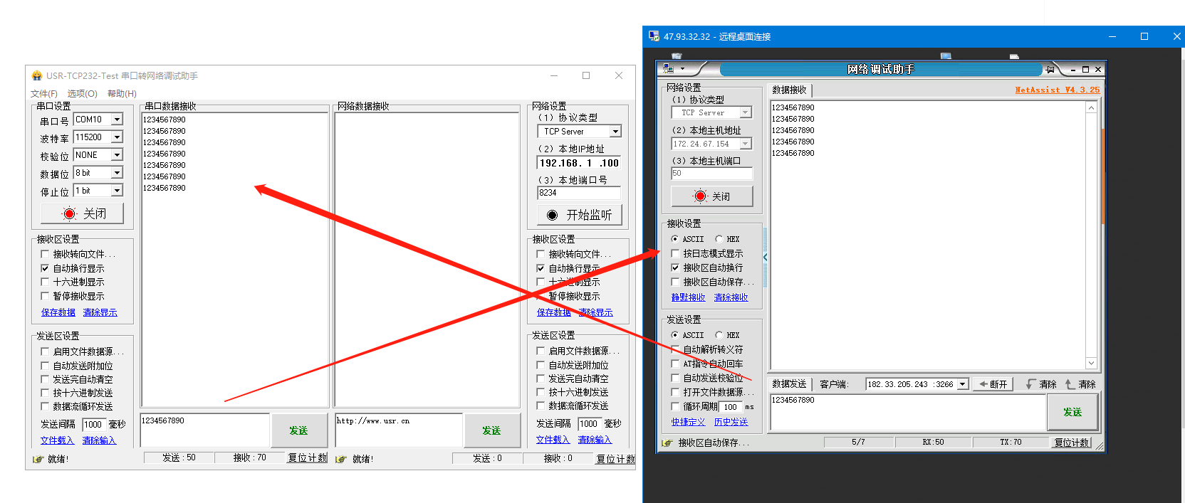 1、打開遠程桌面,打開網絡助手,協議類型做TCP server,端口50,點擊連接。