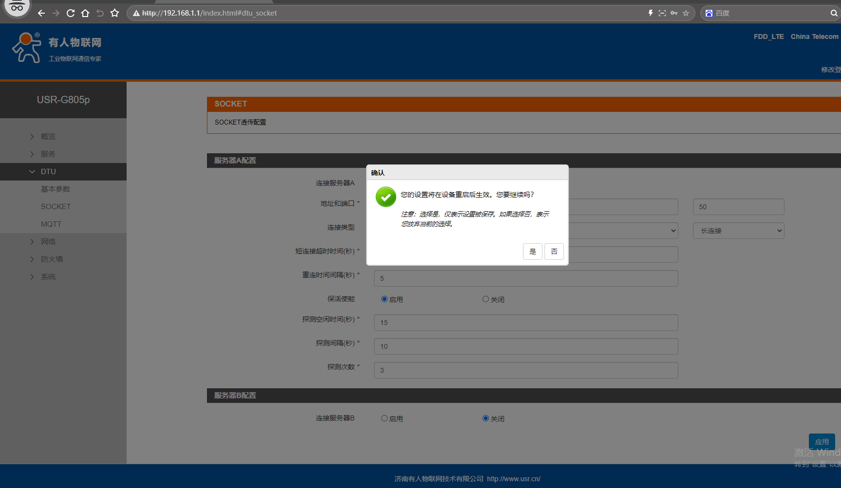 網頁點擊DTU,點擊SOCKET,連接服務器A,點擊啟用,地址填遠程服務器,端口號50,連接類型TCP,長連接。點擊應用。