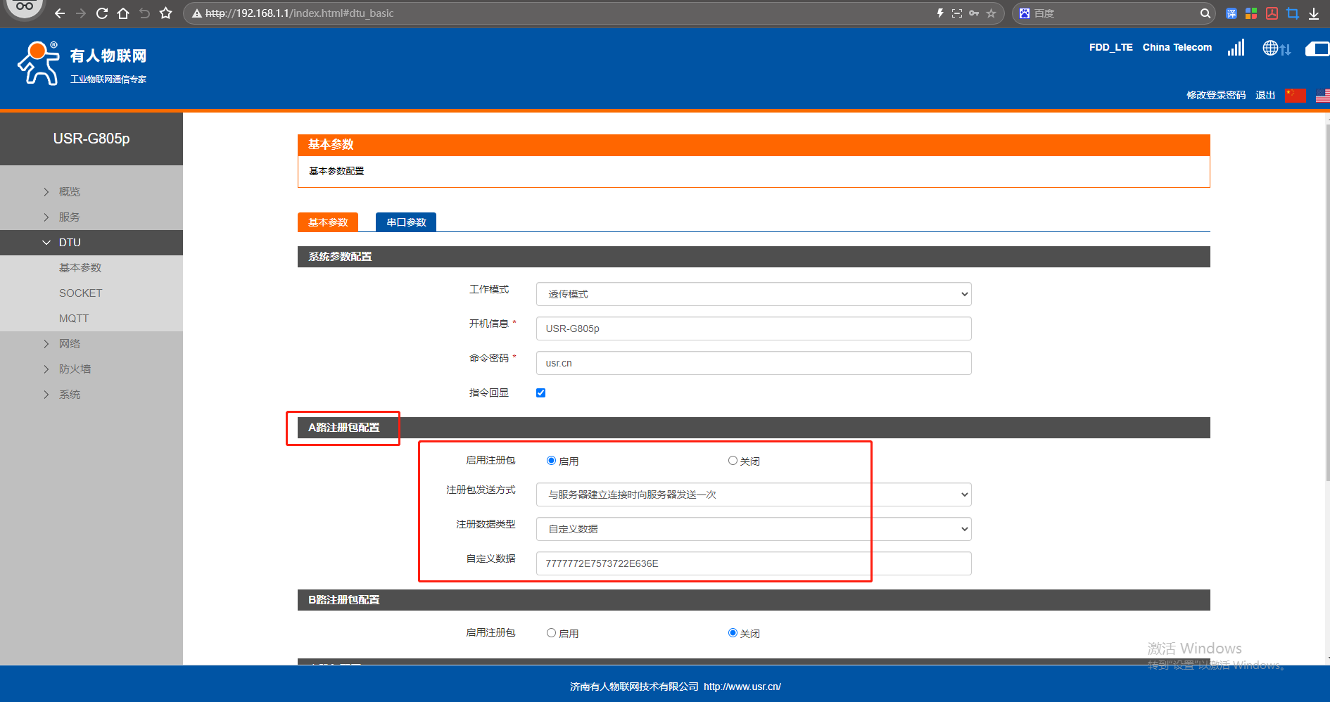 USR-G805p連接遠(yuǎn)程服務(wù)器注冊(cè)包功能示例