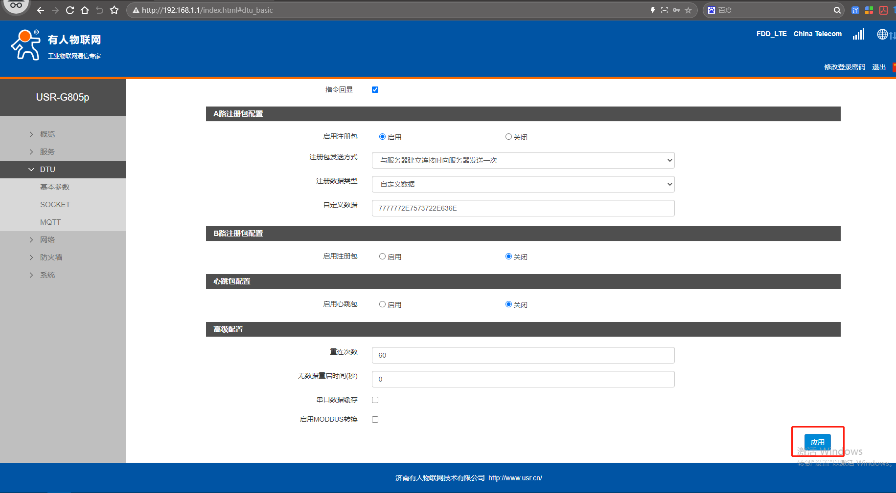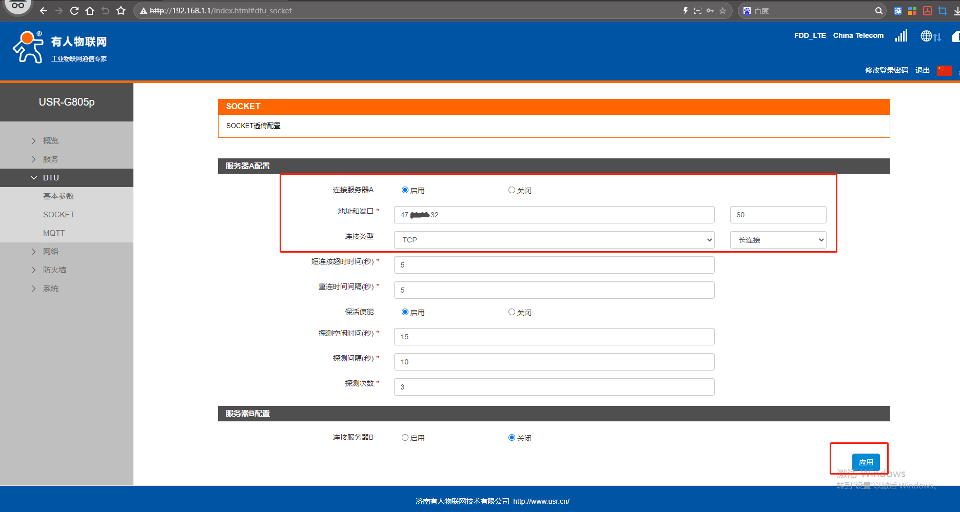網(wǎng)頁點(diǎn)擊DTU,點(diǎn)擊SOCKET,連接服務(wù)器A,點(diǎn)擊啟用,地址填遠(yuǎn)程服務(wù)器,端口號(hào)60,連接類型TCP,長(zhǎng)連接。點(diǎn)擊應(yīng)用。
