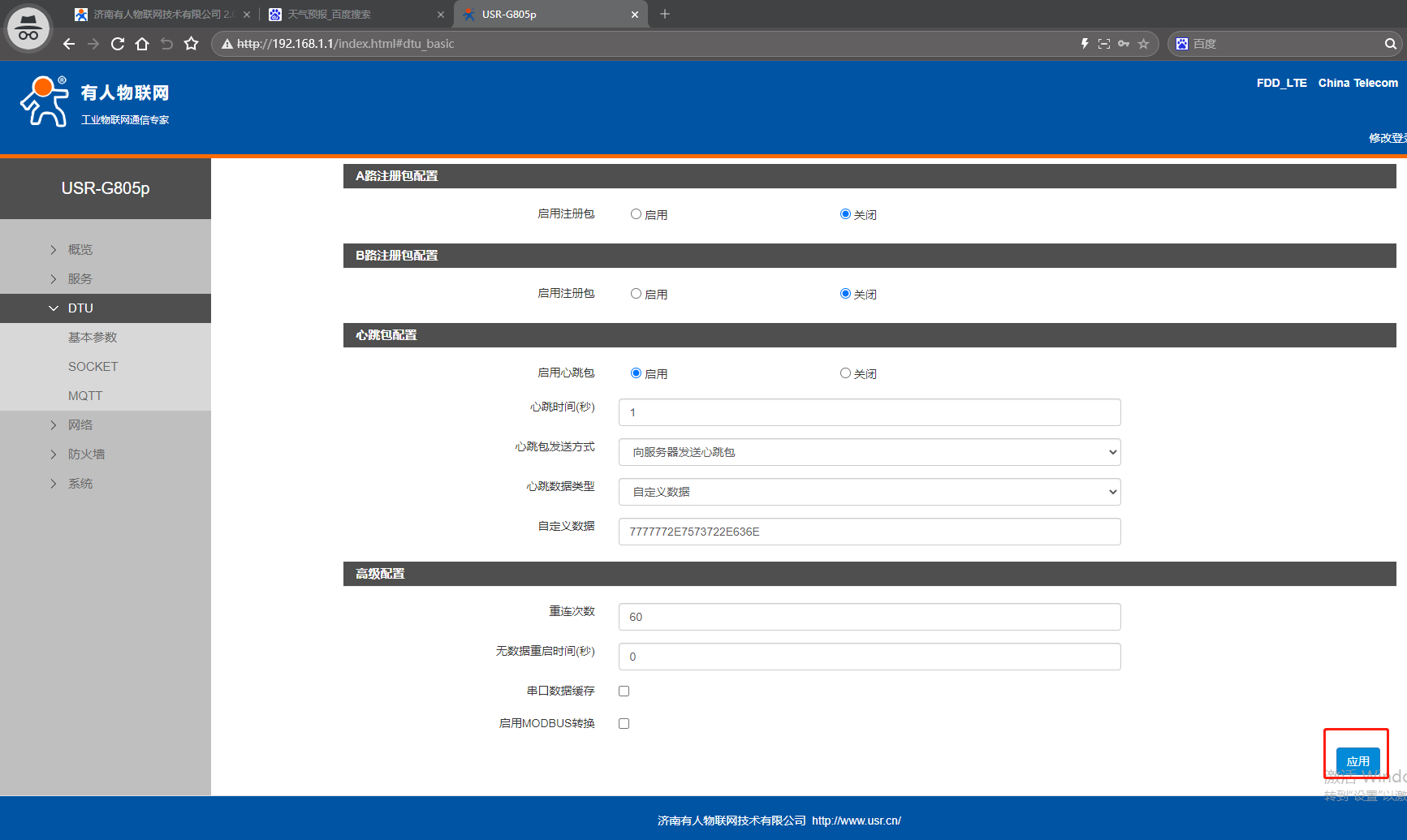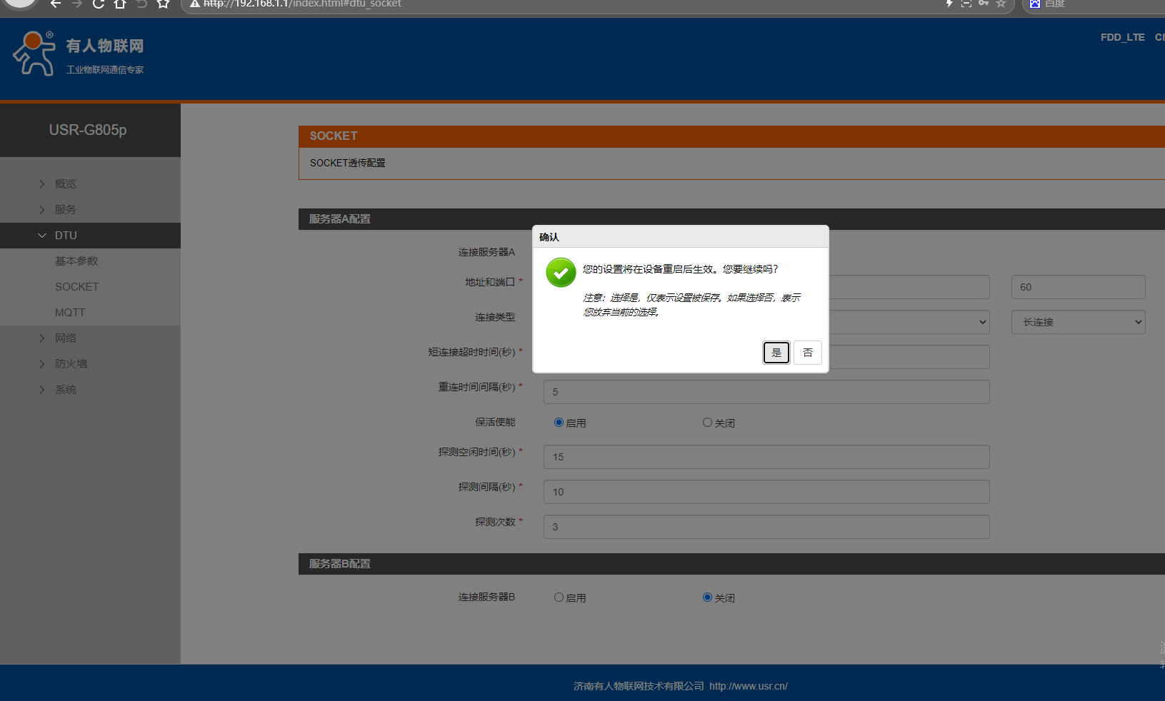 網(wǎng)頁點擊DTU,點擊SOCKET,連接服務器A,點擊啟用,地址填遠程服務器,端口號50,連接類型TCP,長連接。點擊應用。
