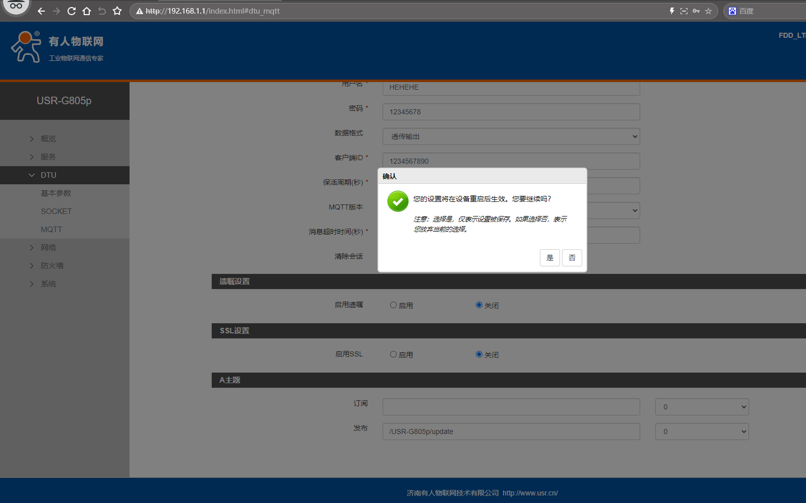 (2)A主題,發(fā)布填寫/USR-G805p/update。