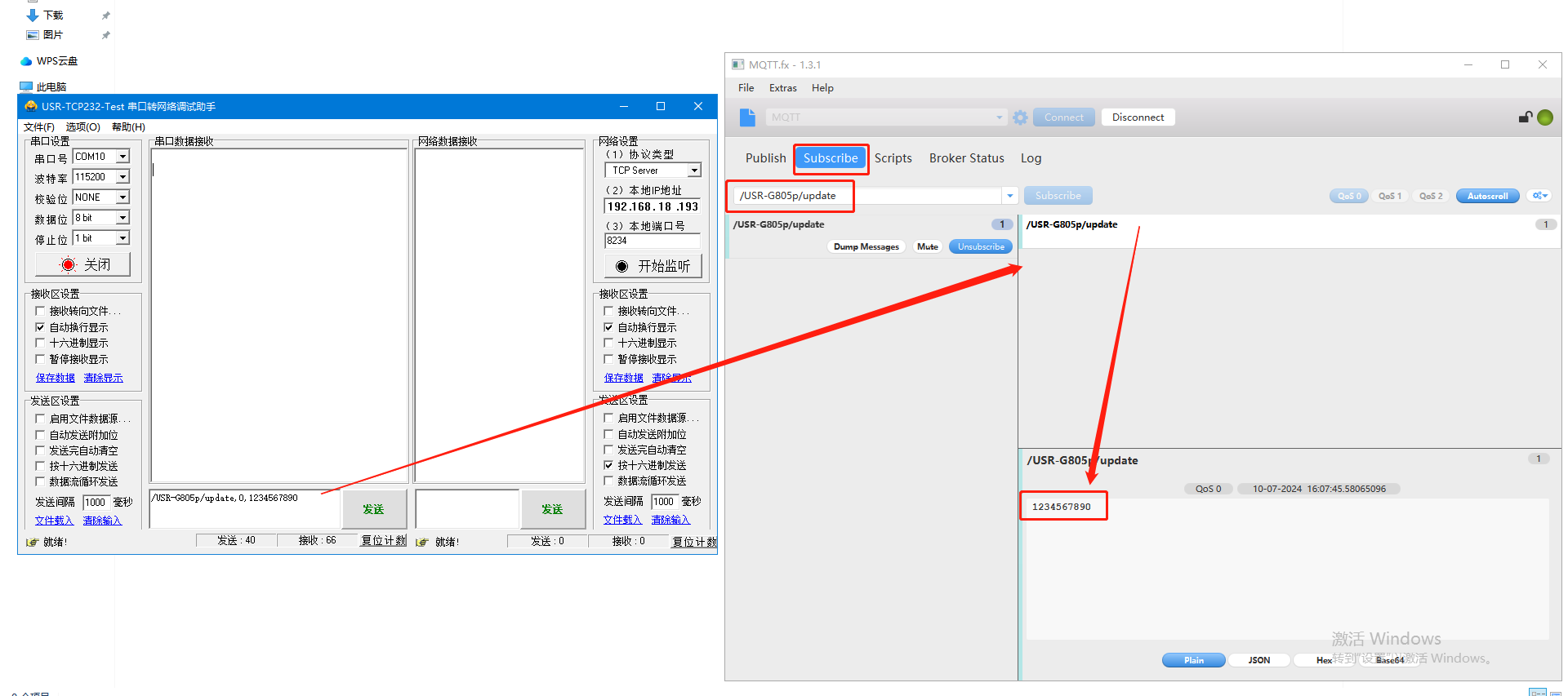 (2)MQTT.fx軟件點擊Subscribe,輸入/USR-G805p/update,點擊后面的Subscribe。串口助手按照格式發(fā)送數(shù)據(jù),/USR-G805p/update,0,1234567890,MQTT.fx軟件接收到數(shù)據(jù)1234567890。