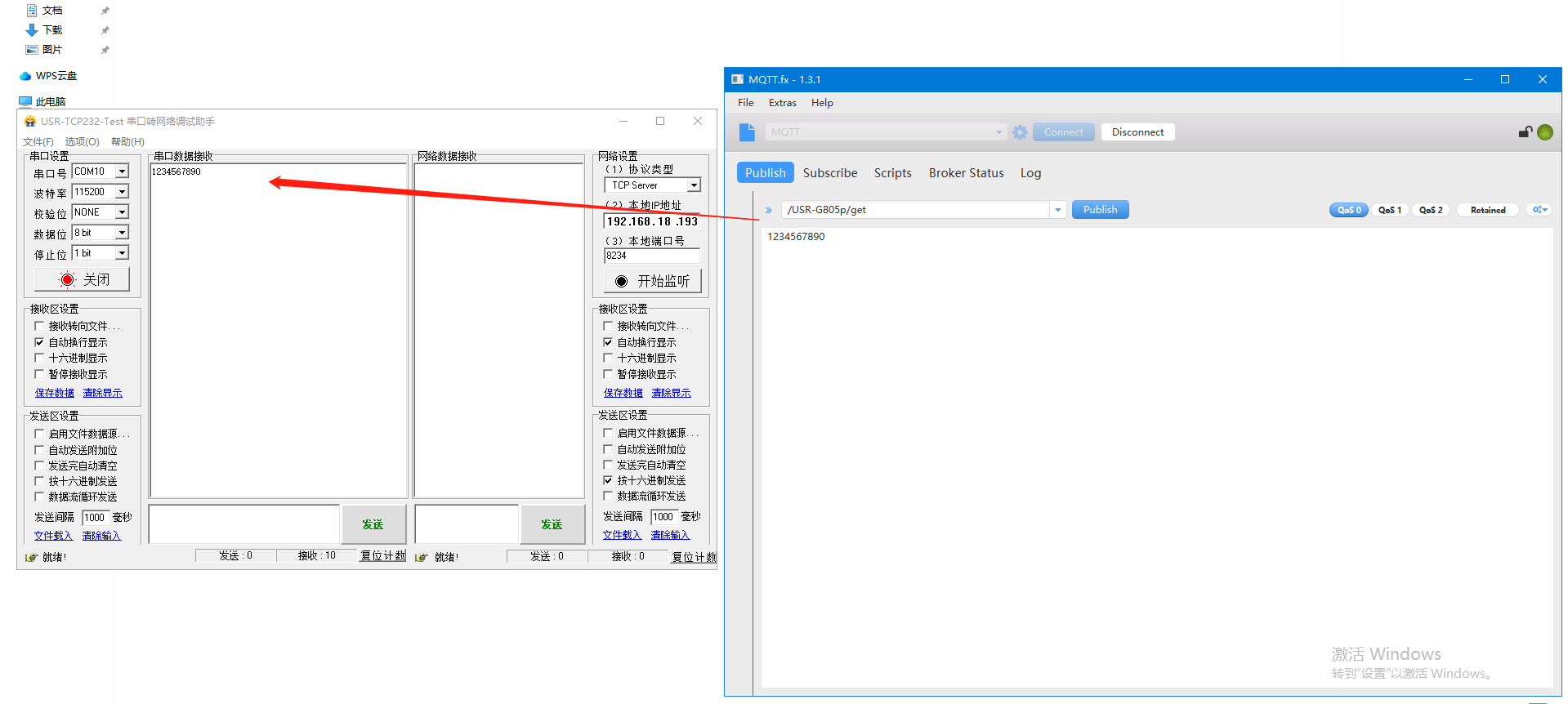 (1)MQTT.fx軟件點擊Publish,輸入/USR-G805p/get,輸入數(shù)據(jù)1234567890,點擊Publish,串口接收到MQTT.fx發(fā)送的數(shù)據(jù)1234567890。