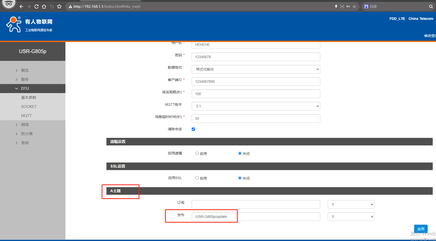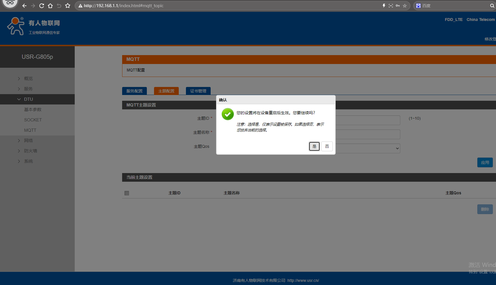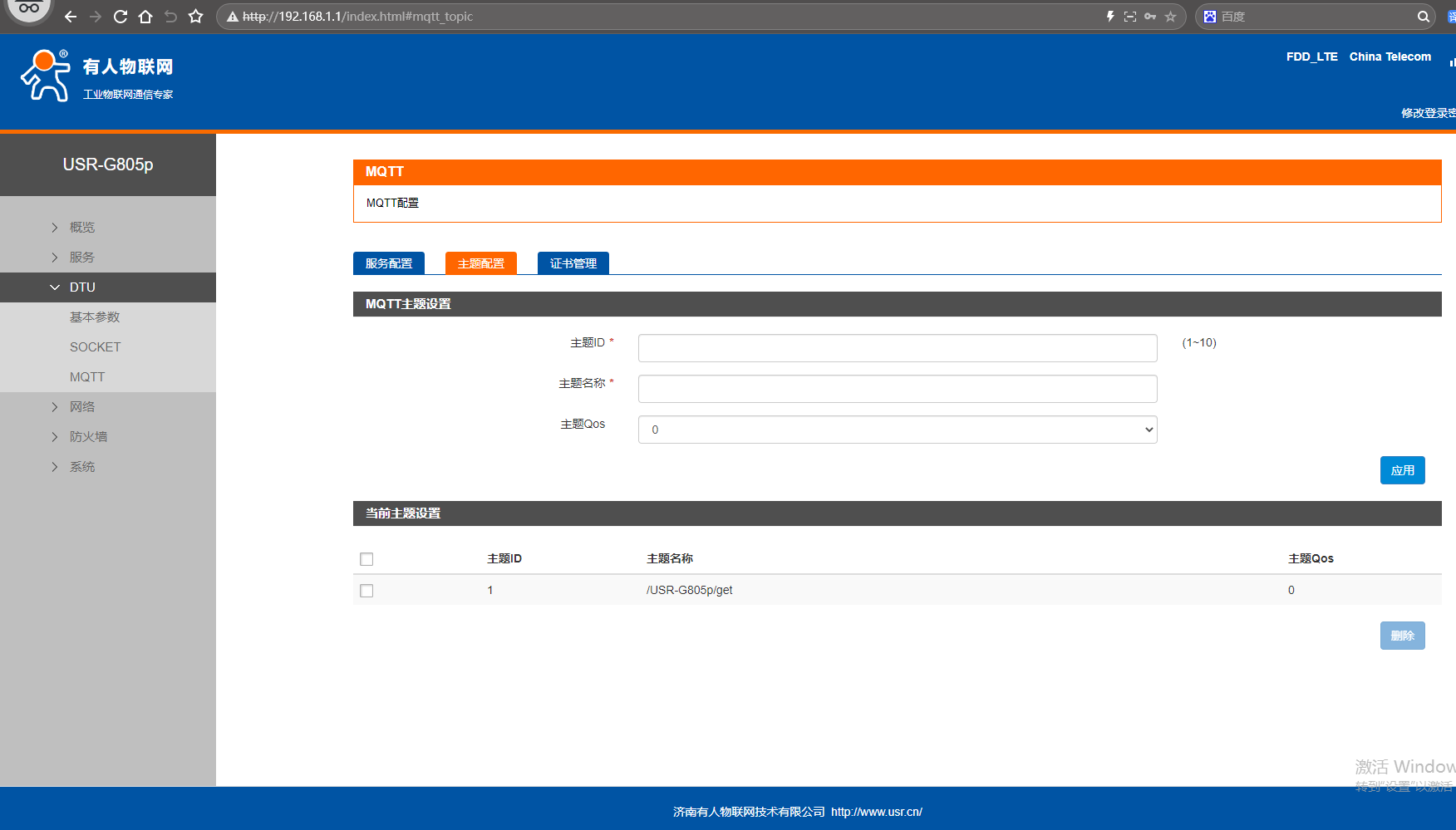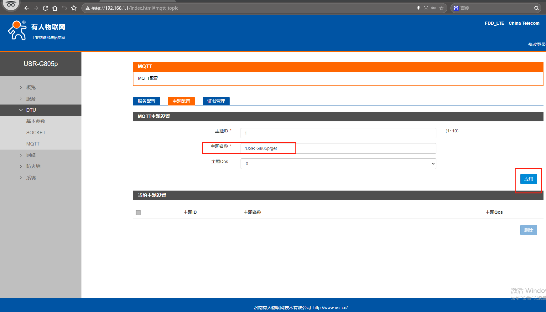 網頁點擊MQTT,點擊主題配置,主題ID設置1,主題名稱/USR-G805p/get,主題Qos填0。點擊應用。
