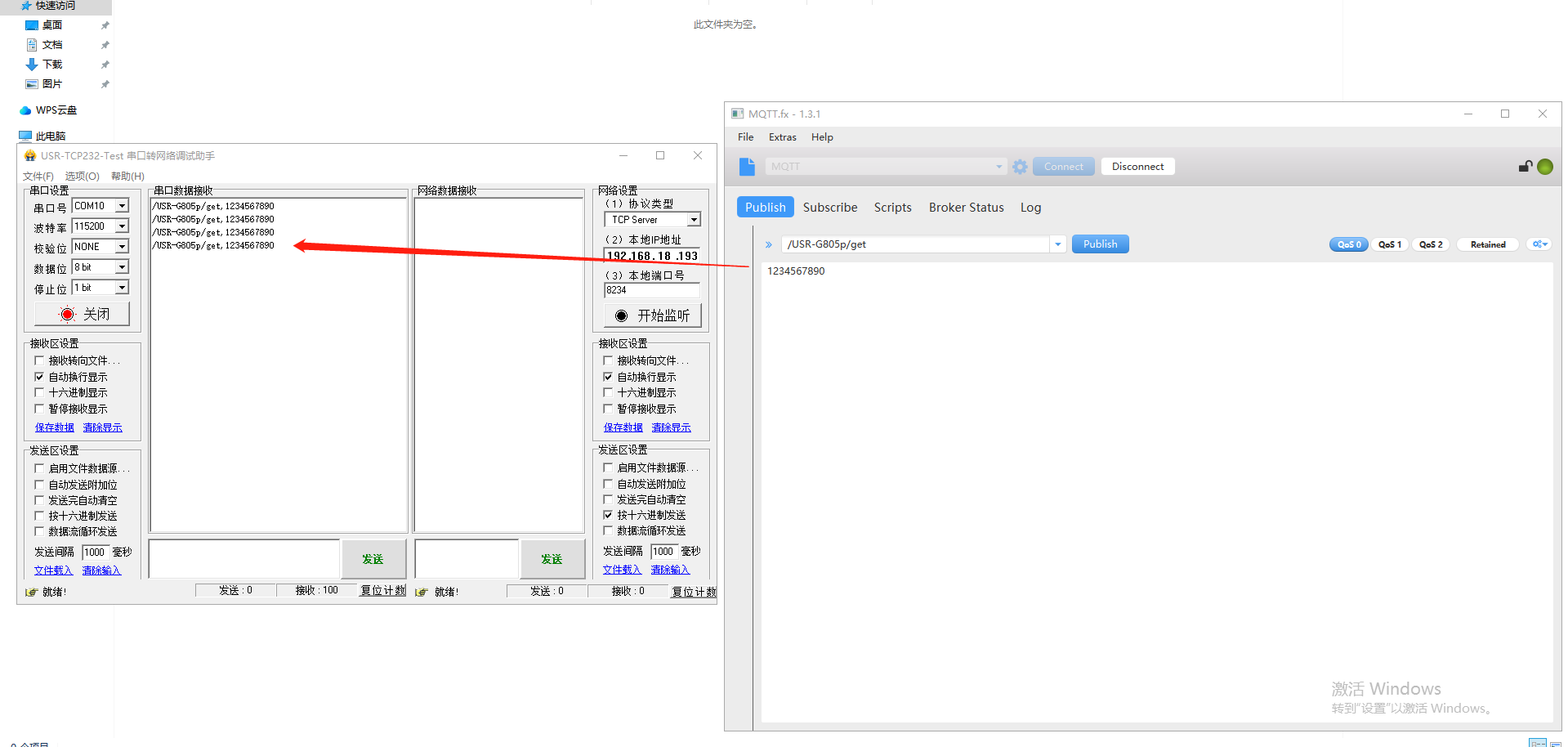 (1)MQTT.fx軟件點擊Publish,輸入/USR-G805p/get,輸入數據1234567890,點擊Publish,串口按照格式接收到MQTT.fx發送的數據/USR-G805p/get,1234567890。