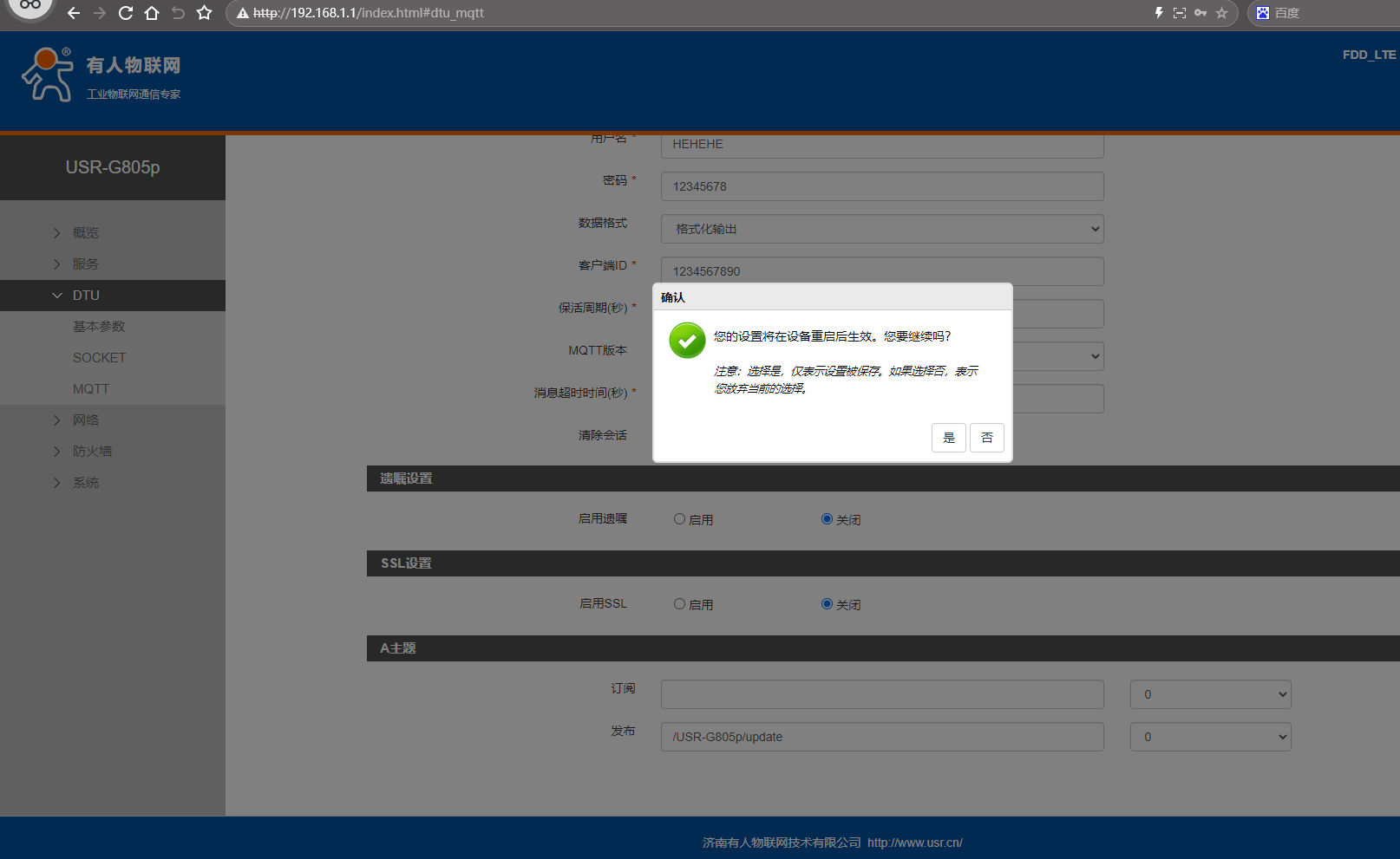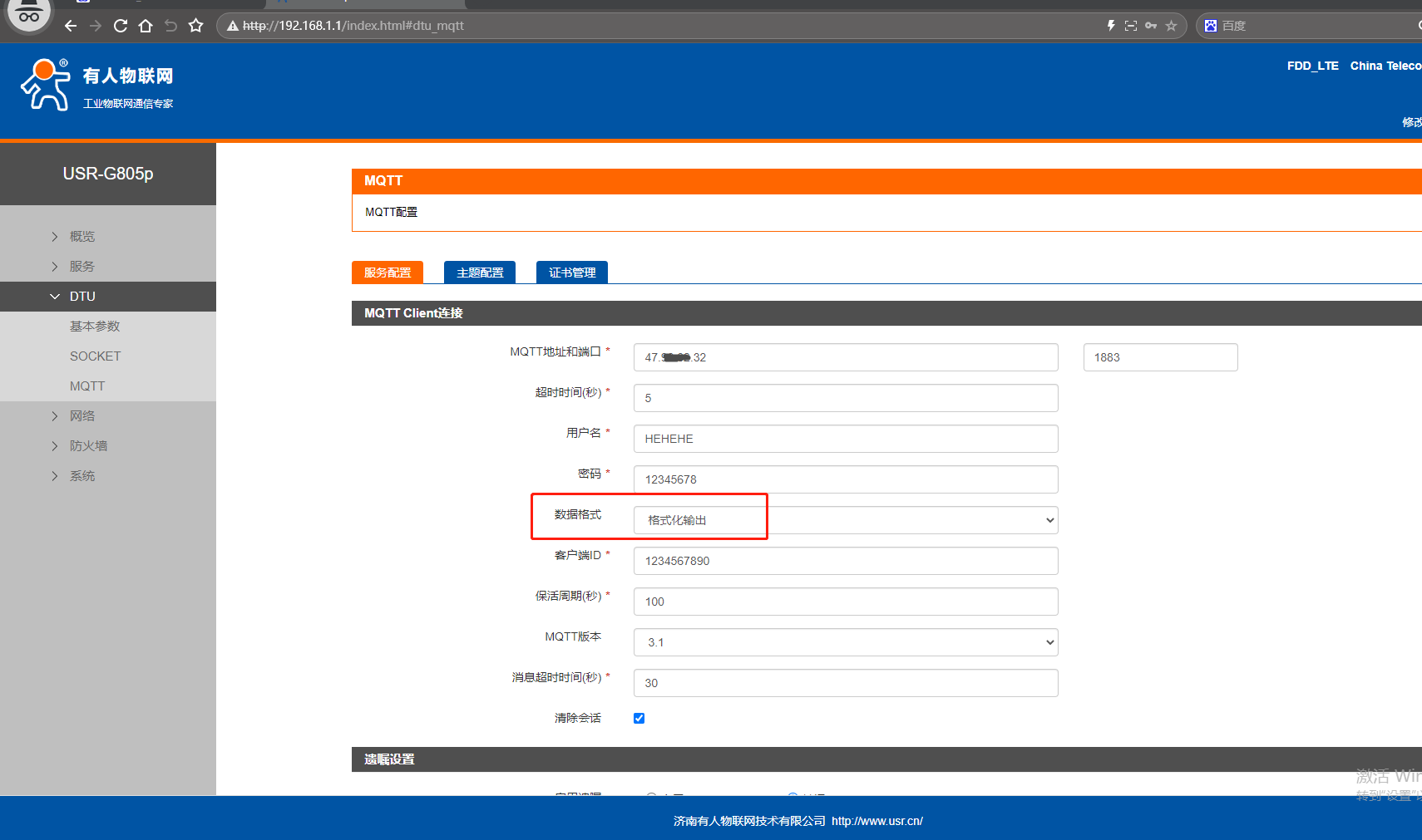 (2)服務器地址填和USR-G805p連接的同一個MQTT服務器地址