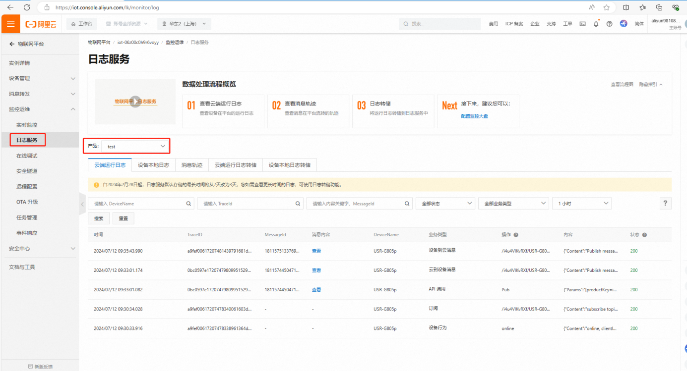 (3)USR-G805p使用串口助手發(fā)送數據/i4u4VIKvRXf/USR-G805p/user/update,0,1234567890,發(fā)送完成之后,我們在阿里云平臺可以通過日志服務,點擊查看,看到USR-G805p串口發(fā)到阿里云的數據1234567890。