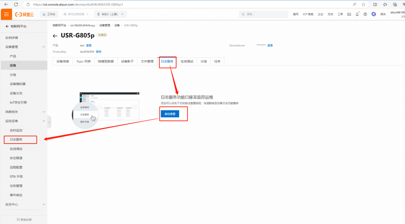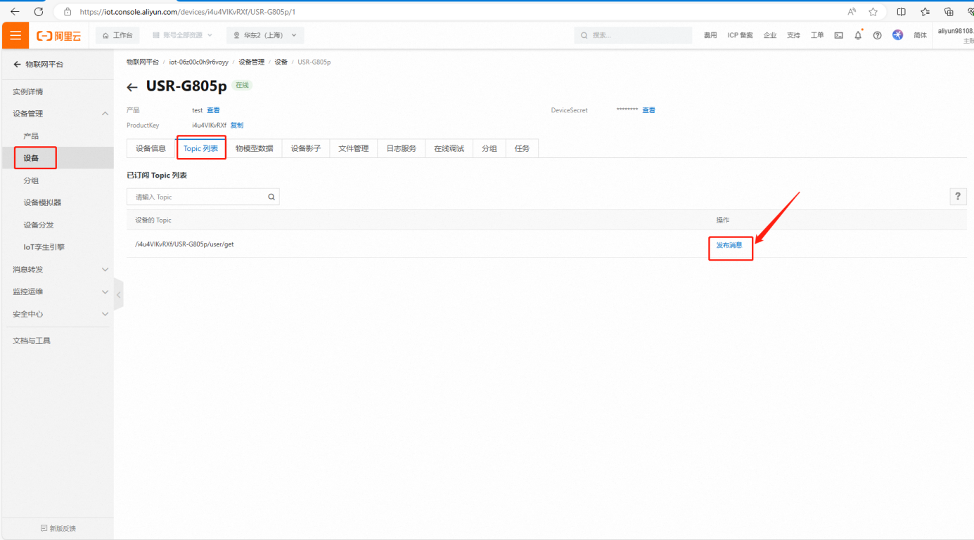 USR-G805p連接阿里云的用戶名:USR-G805p&i4u4VIKvRXf