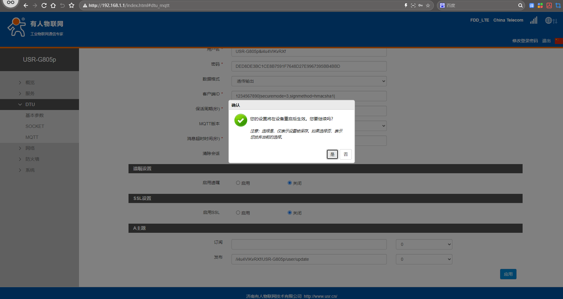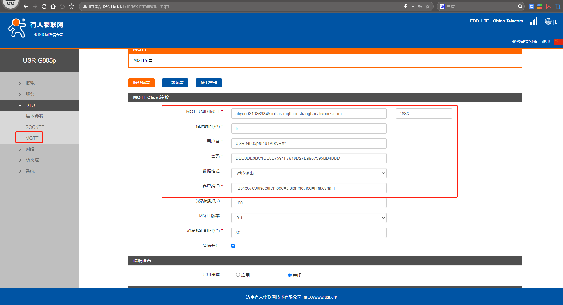 USR-G805p MQTT連接阿里云透傳輸出示例