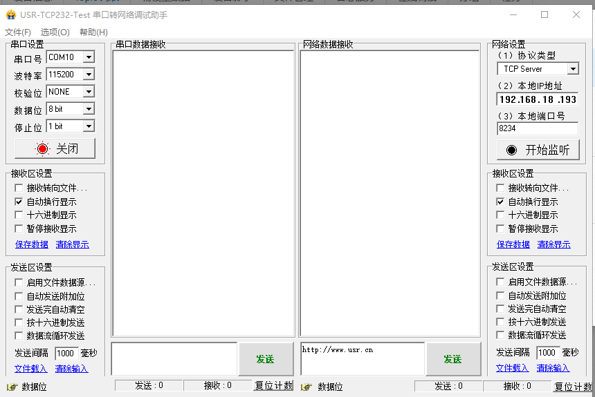 (3)打開一個串口助手,串口參數設置和USR-G805p串口參數一致,做串口數據接收和發(fā)送。