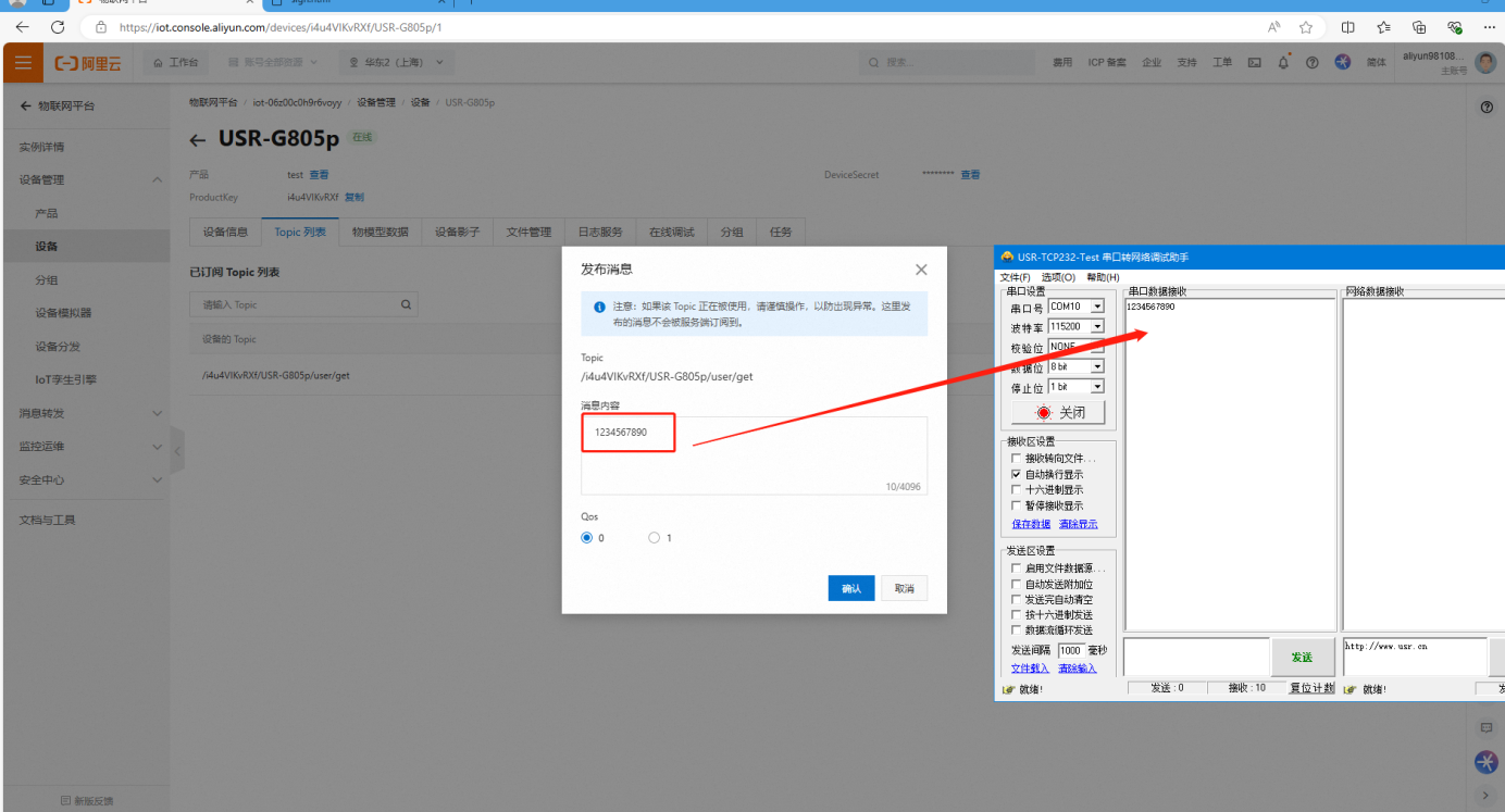 (4)使用阿里云平臺發(fā)布的消息1234567890,被USR-G805p訂閱到,并通過USR-G805p串口發(fā)給串口端,數據格式是透傳輸出,串口助手接收的數據1234567890