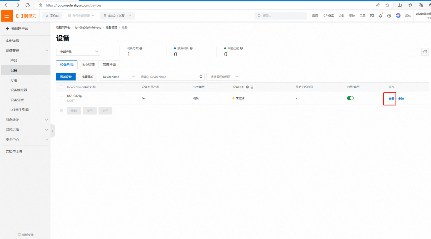 (2)添加完設備,如下圖展示,設備狀態(tài)是未激活,等設置完USR-G805p的MQTT連接阿里云參數之后,設備狀態(tài)才顯示在線。