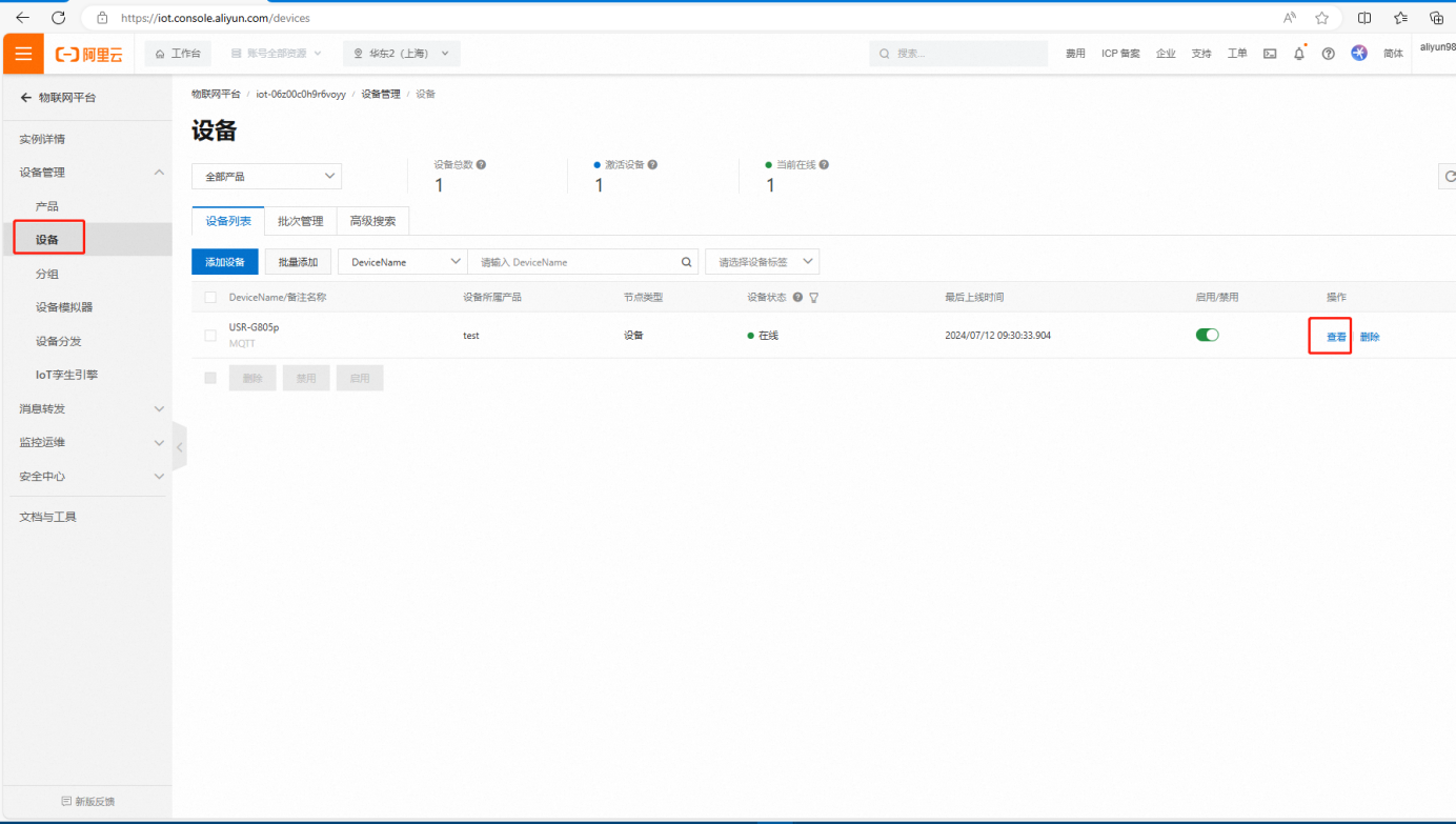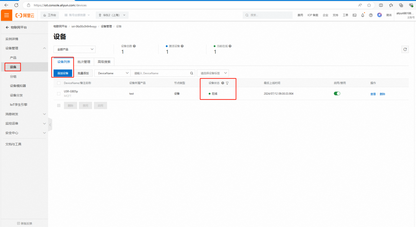 USR-G805p 設置完MQTT連接阿里云參數,聯網正常,在阿里云平臺可以看到設備狀態(tài)是在線。