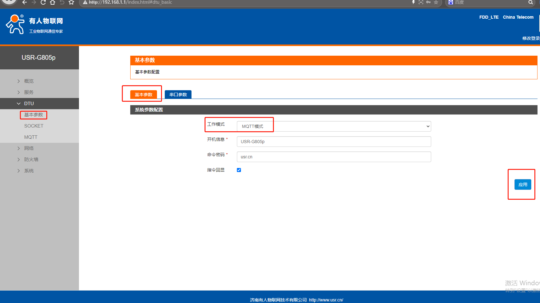 網頁點擊DTU,點擊基本參數,工作模式選擇MQTT模式。點擊應用。