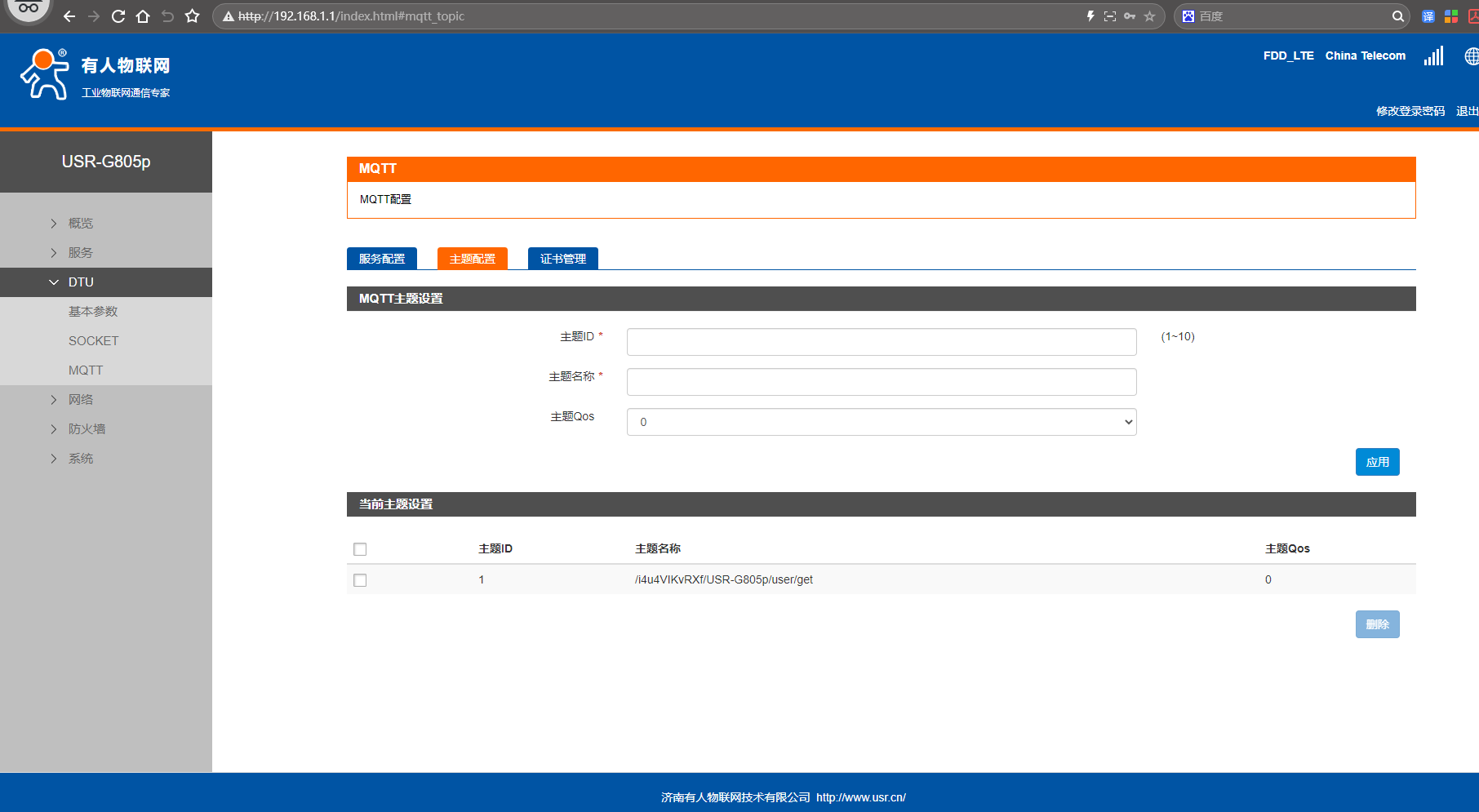網頁點擊MQTT,點擊主題配置,主題ID設置1,主題名稱/i4u4VIKvRXf/USR-G805p/user/get,主題Qos填0。點擊應用。