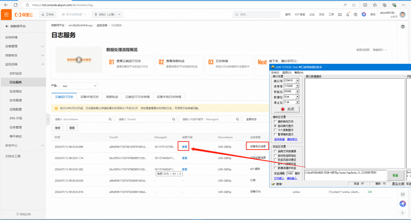 (3)USR-G805p使用串口助手發(fā)送數(shù)據(jù)/i4u4VIKvRXf/USR-G805p/user/update,0,1234567890,發(fā)送完成之后,我們在阿里云平臺可以通過日志服務(wù),點擊查看,看到USR-G805p串口發(fā)到阿里云的數(shù)據(jù)1234567890。