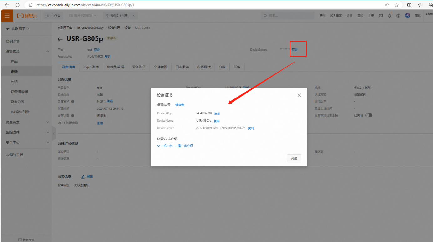 (1)點擊設(shè)備,點擊查看,再點擊DeviceSecret后面的查看。