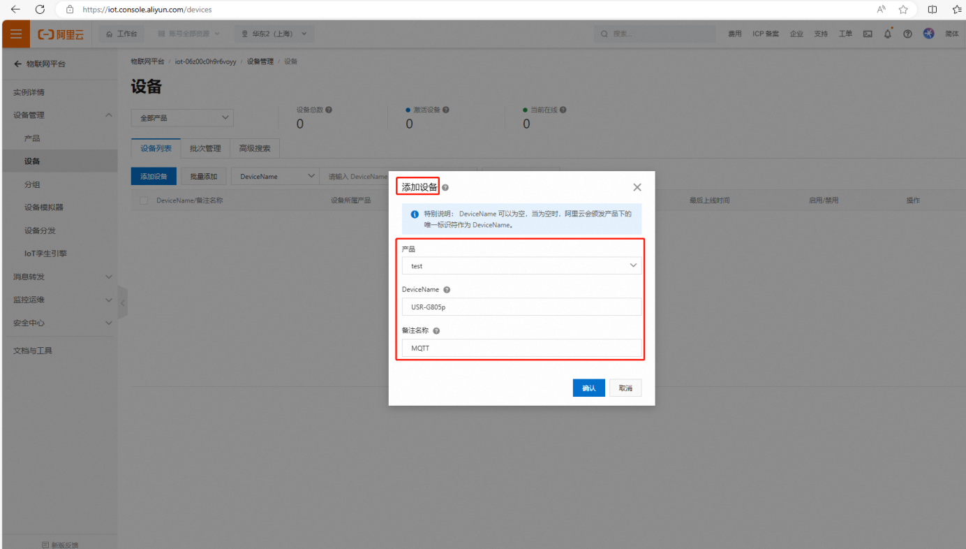 (1)產(chǎn)品創(chuàng)建成功后,添加設(shè)備。點擊設(shè)備,點擊添加設(shè)備,產(chǎn)品名舉例填test,DeviceName填USR-G805p,備注名稱填MQTT,點擊確認(rèn)。