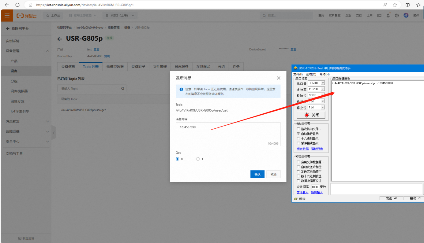 (4)使用阿里云平臺發(fā)布的消息1234567890,被USR-G805p訂閱到,并通過USR-G805p串口發(fā)給串口端,數(shù)據(jù)格式是格式化輸出,串口助手接收帶格式的數(shù)據(jù)/i4u4VIKvRXf/USR-G805p/user/get,1234567890