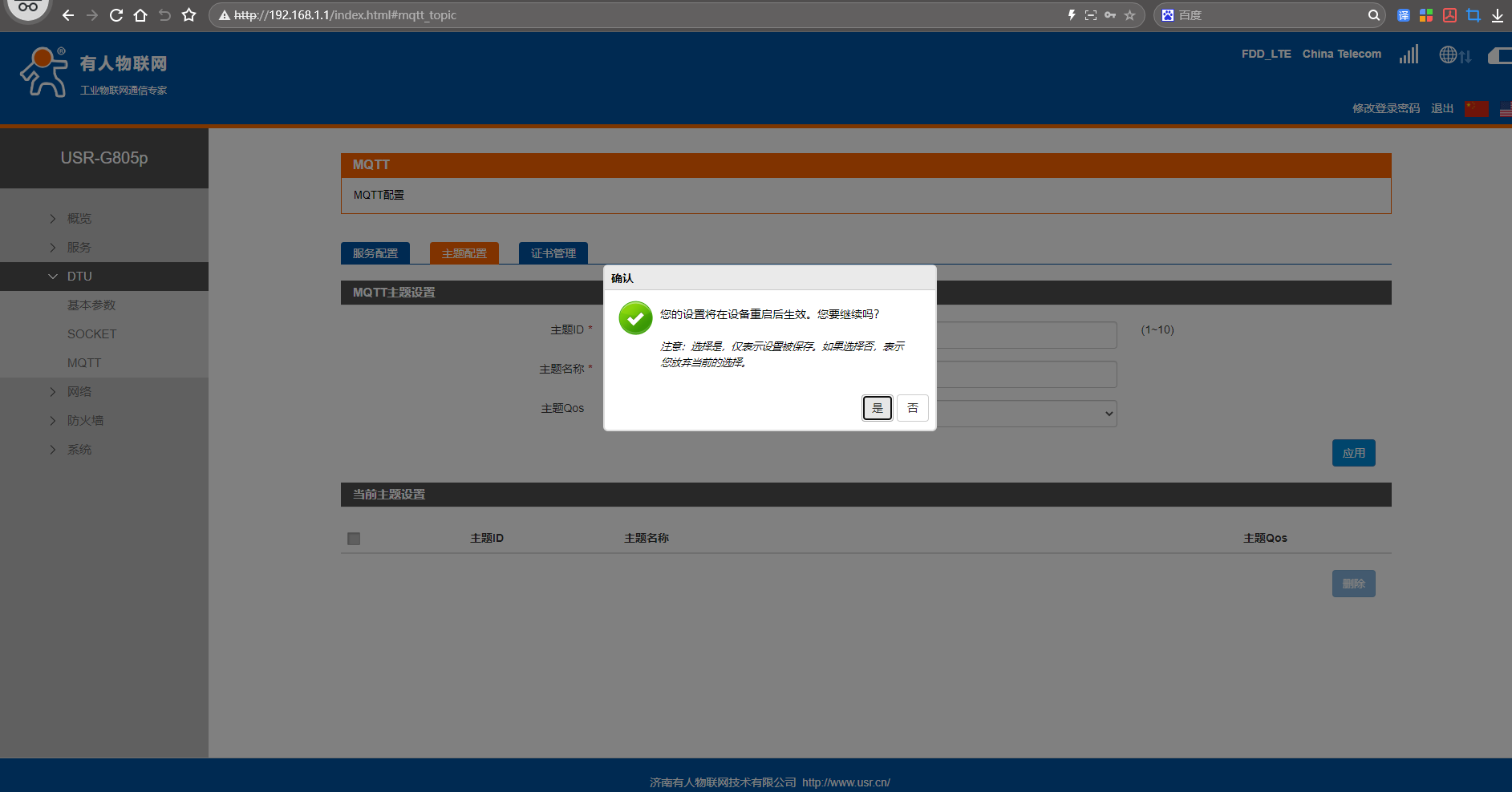 網(wǎng)頁點擊MQTT,點擊主題配置,主題ID設(shè)置1,主題名稱/i4u4VIKvRXf/USR-G805p/user/get,主題Qos填0。點擊應(yīng)用。
