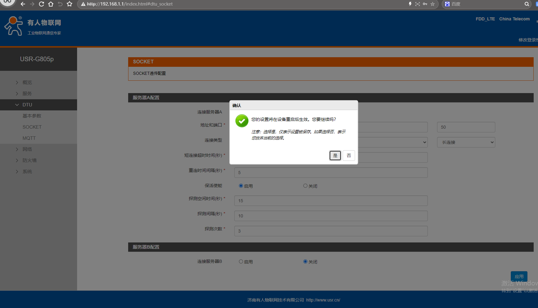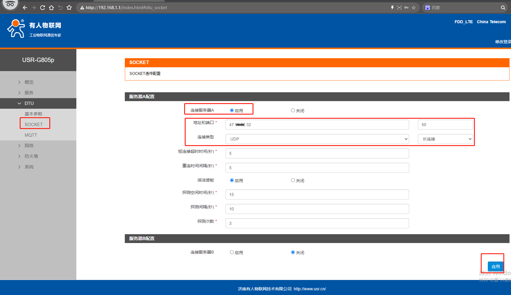 網(wǎng)頁點(diǎn)擊DTU,點(diǎn)擊SOCKET,連接服務(wù)器A,點(diǎn)擊啟用,地址填遠(yuǎn)程服務(wù)器,端口號(hào)50,連接類型UDP,長(zhǎng)連接。點(diǎn)擊應(yīng)用。