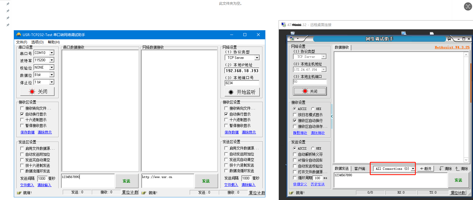 2、打開串口助手,選擇USB-RS485串口線的COM口號,串口參數和USR-G805p一致。測試串口向服務器網絡發送數據,遠程桌面TCP連接建立,串口再發數據,服務器接收到數據。不發送數據,TCP連接會斷開,這就是短連接。