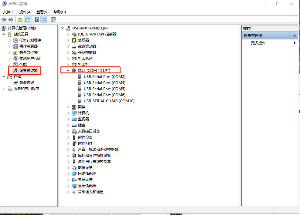 電腦鼠標點擊計算機管理,右擊,點開設備管理器,點擊端口,查看接USR-N510-H7的USB-RS485串口線COM口號,COM10。