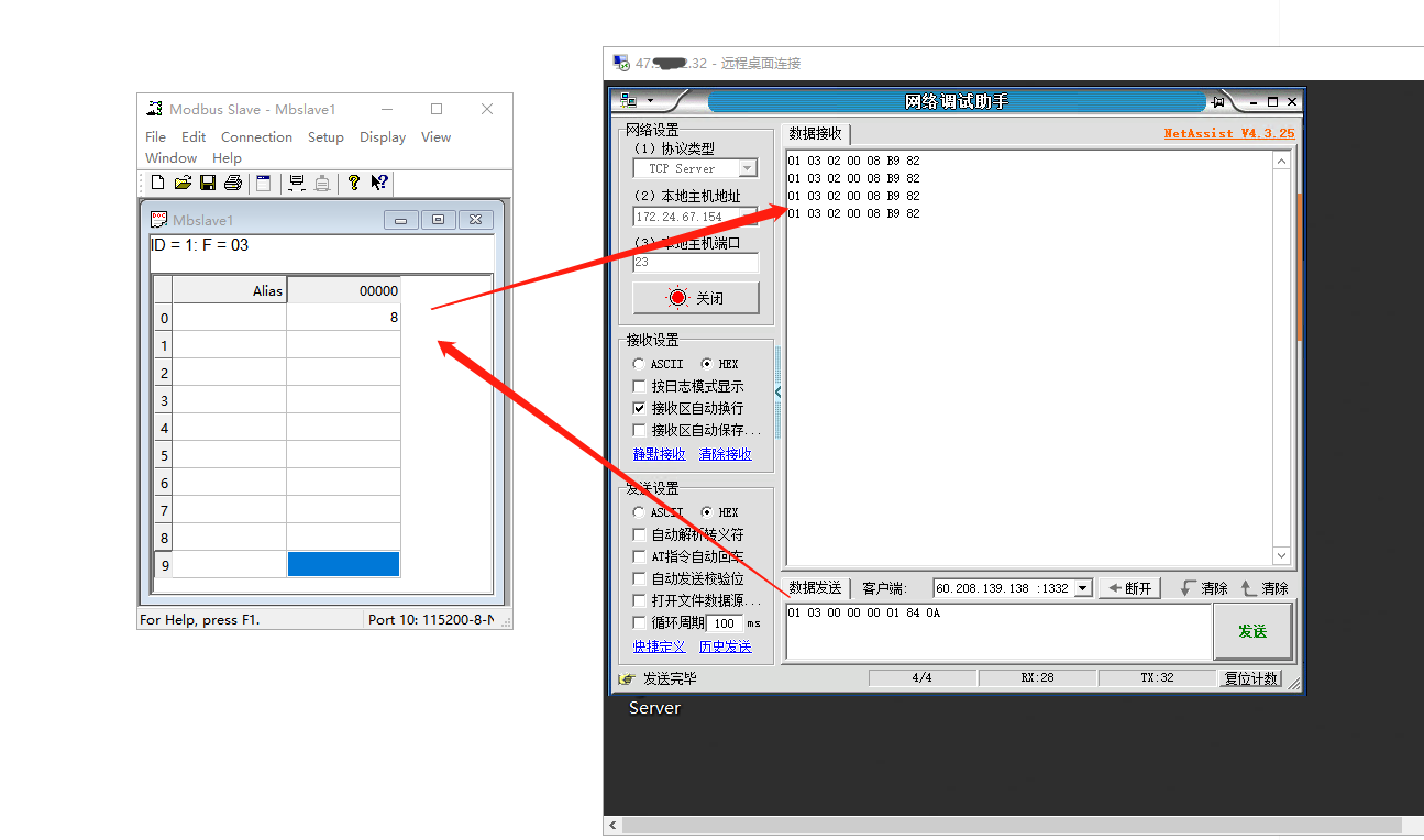 (2)改變MODBUS SLAVE寄存器地址里面的數據,填數據8。遠程服務器網絡助手發送命令,采集數據,收到十六進制的MODBUS RTU信息,01 03 02 00 08 B9 82,其中01是從機號,03是功能碼,02是數據占用字節長度,00 08(十六進制)是寄存器地址0里面的數據十進制8,B9 82是MODBUS RTU校驗位。
