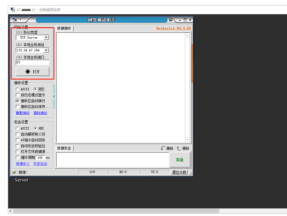 1、登陸遠程服務器,打開網絡助手,做TCP server,端口23,點擊打開。