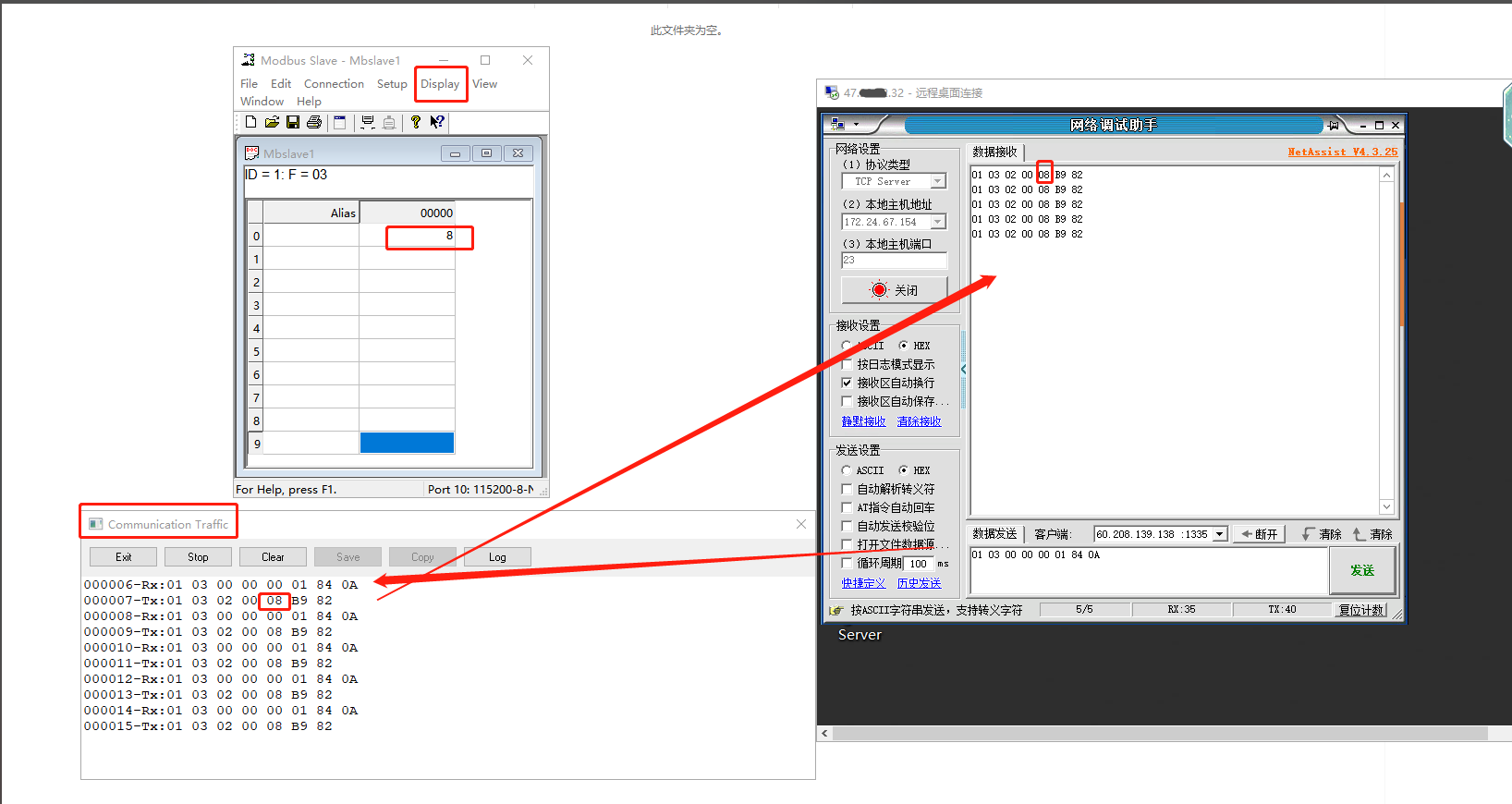 3、數據監控,MODBUS SLAVE,點擊Display,找到Communication Traffic,點開就可以看到后臺數據交互,發送和接收。