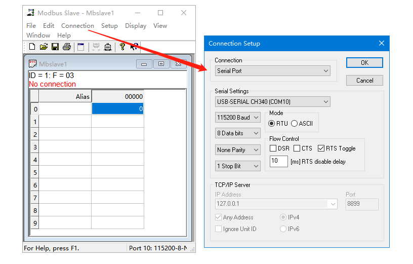 Modbus Slave軟件,點擊Connection,選擇Serial Port,選擇對應的COM口COM10,對應USR-N510-H7的串口參數115200,最后點擊OK。