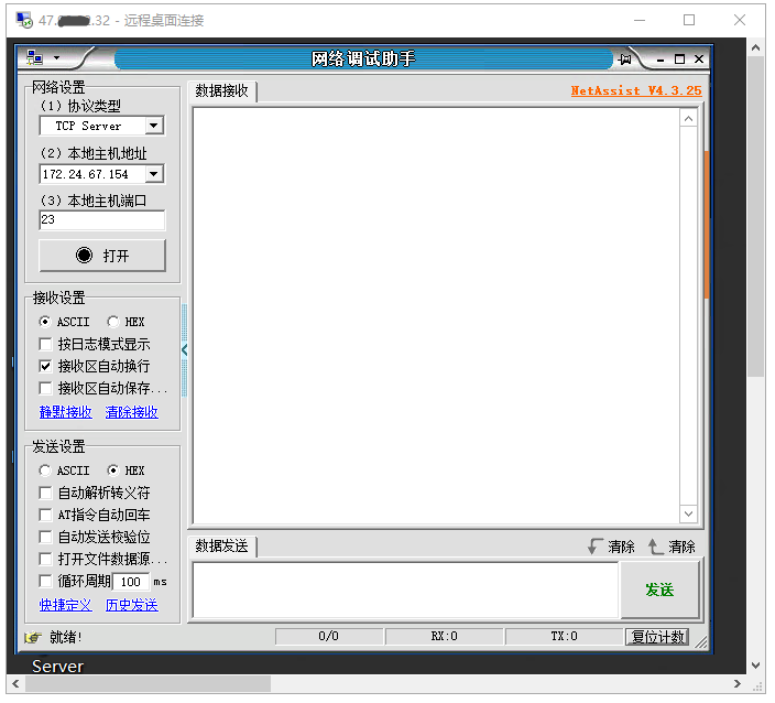 1、登陸遠程服務器,打開網絡助手,做TCP server,端口23,點擊打開。