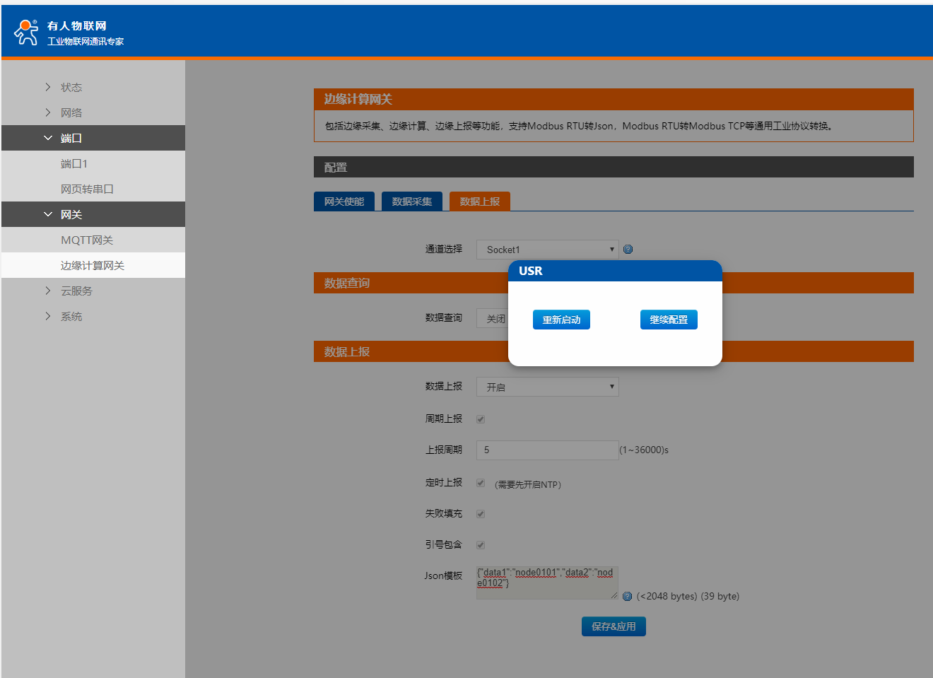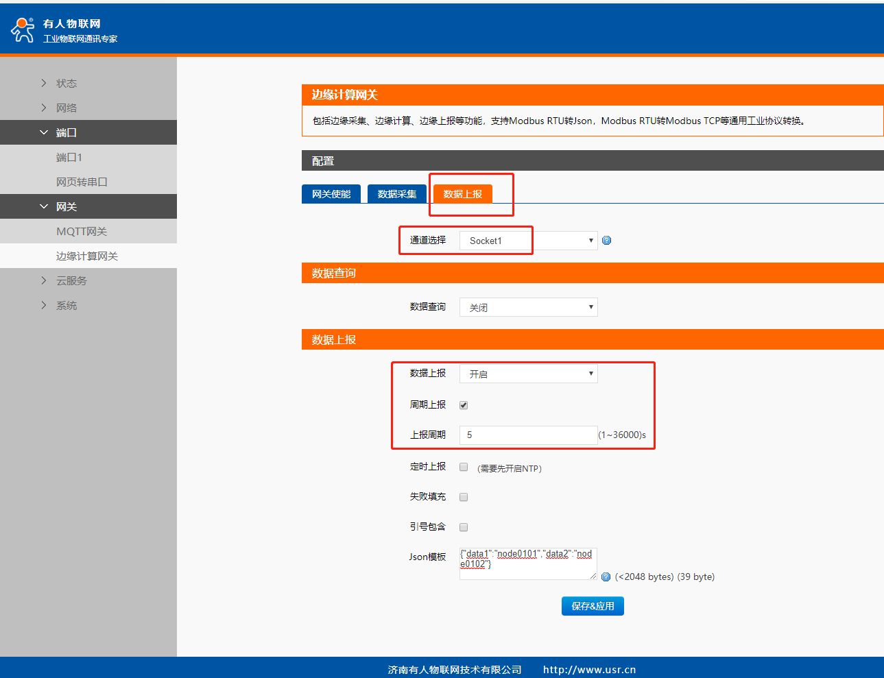 (3)點擊網關,點擊邊緣計算網關,點擊數據上報,通道選擇Socket1,數據上報開啟,周期上報勾選,上報周期5s,Json模版{"data1":"node0101","data2":"node0102"}。點擊保存&應用。