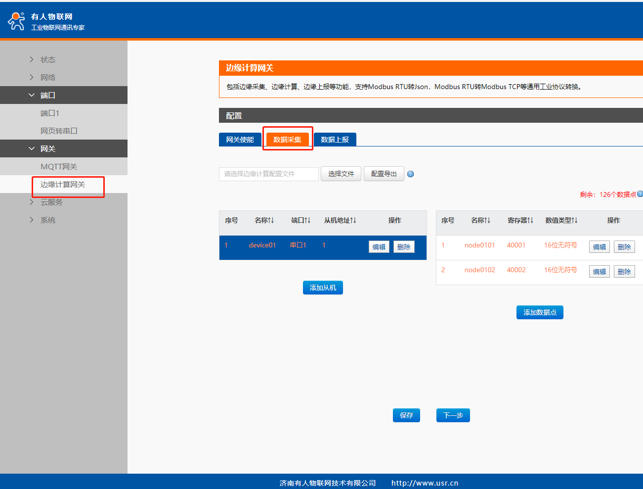 (2)點擊網關,點擊邊緣計算網關,點擊數據采集,添加從機1,添加2個數據點,第1個數據點名稱node0101,寄存器40001,對應讀取實際寄存器地址0的數據。第2個數據點名稱node0102,寄存器40002,對應讀取實際寄存器地址1的數據。點擊保存。