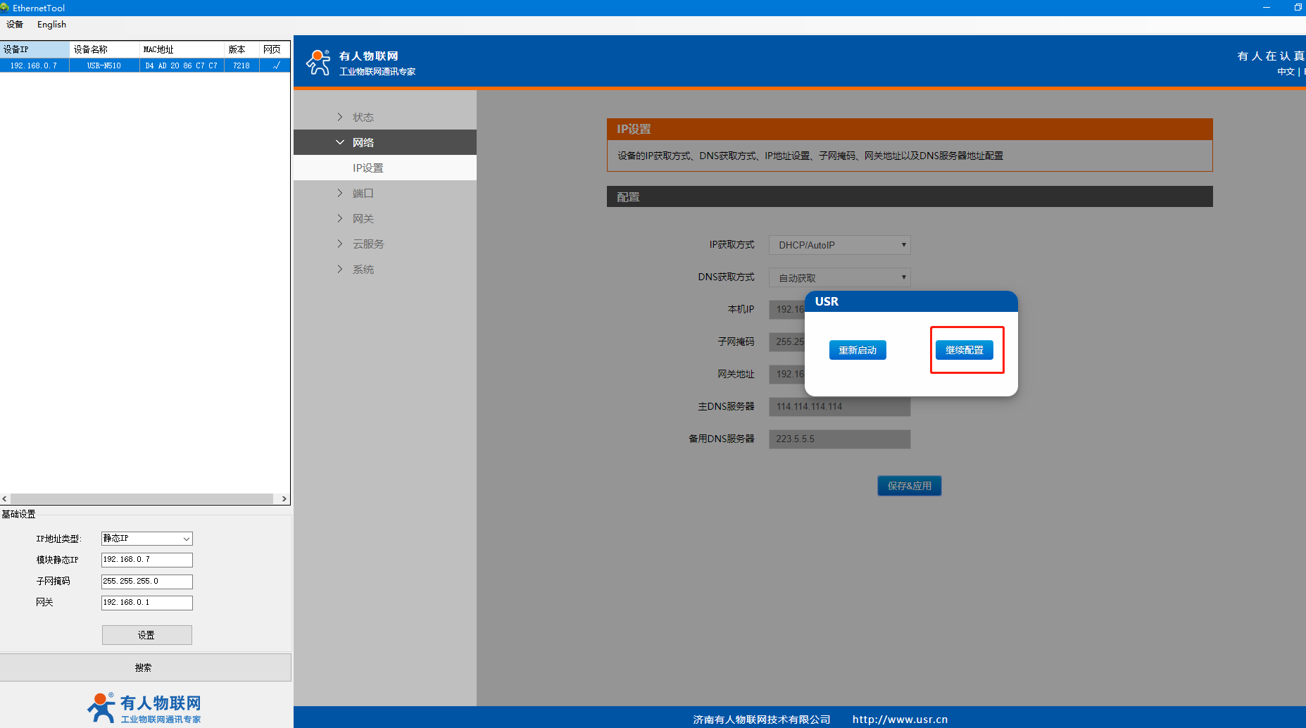(4)最后點擊重新啟動,USR-N510-H7設置DHCP獲取IP之后,網口用網線連接可以上外網的路由器,電腦連接同一個路由器。