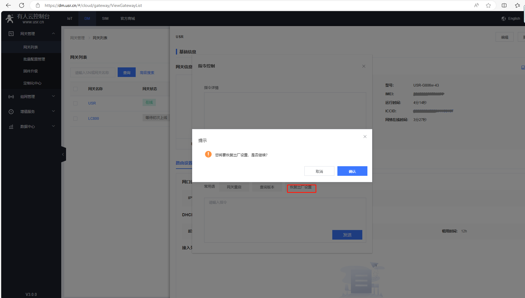 (1)在指令控制彈框,點擊恢復出廠設置,點擊確認,可以將路由器恢復出廠設置。