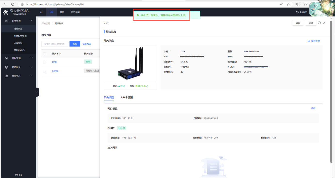 USR-G806w上電聯網,可通過插卡、有線連上級路由和WiFi連上級路由聯網。須確保網絡能訪問到有人云。