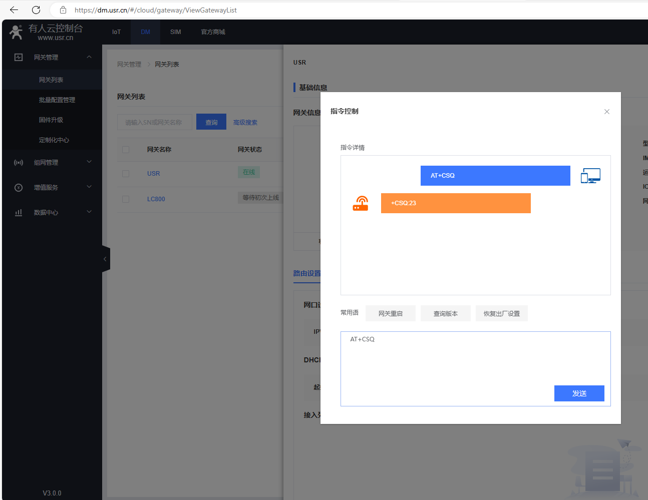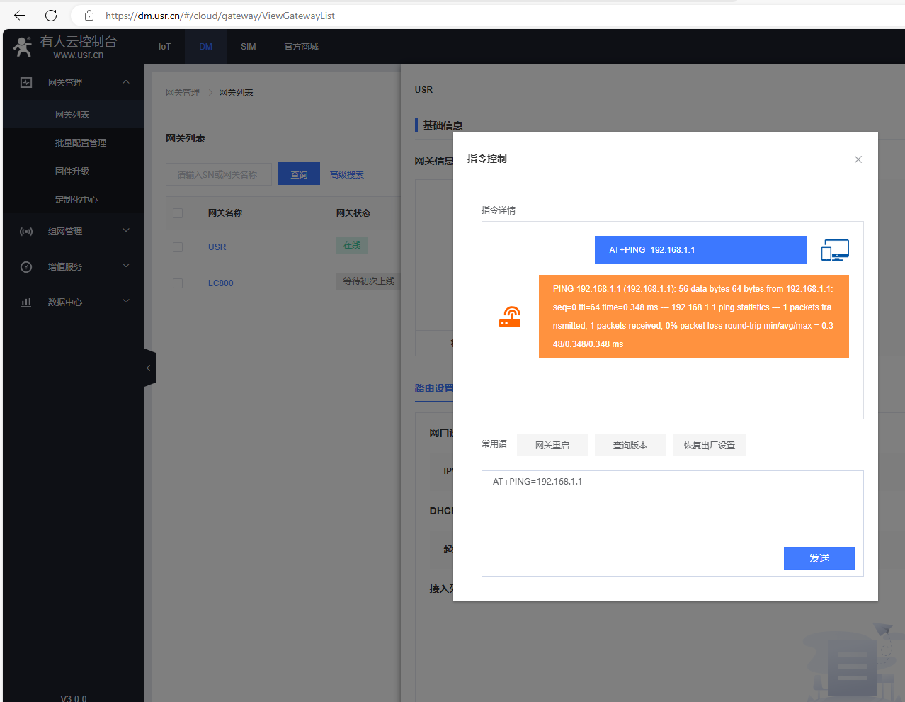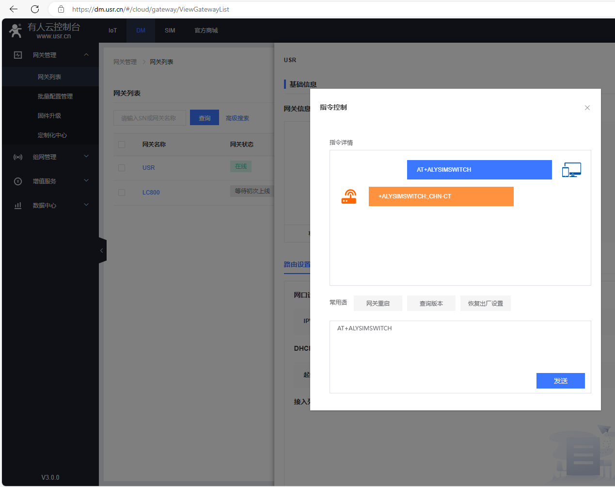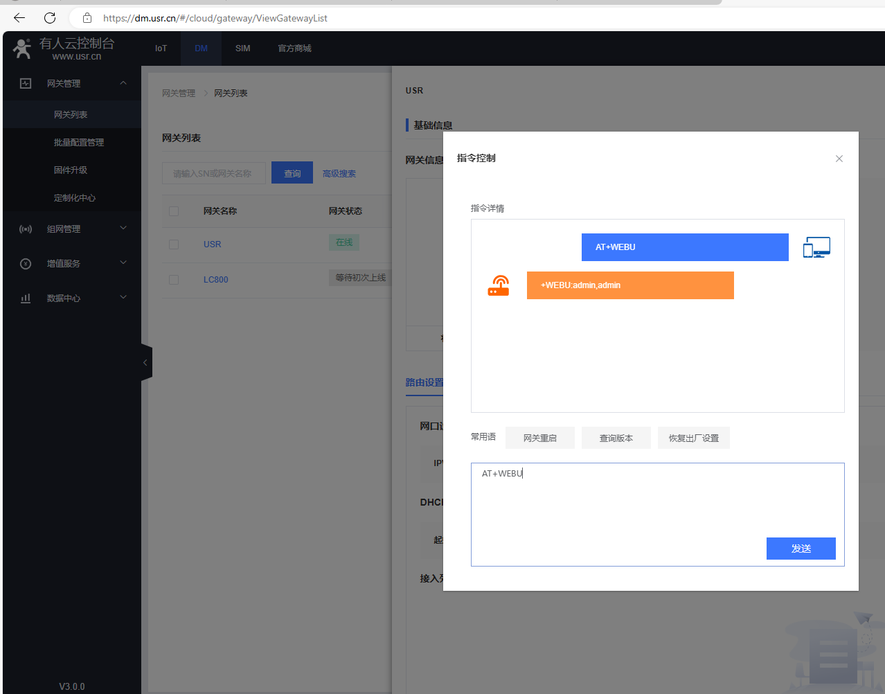 在指令控制彈框,發送AT+R重啟USR-G806w的AT指令,網關重啟。