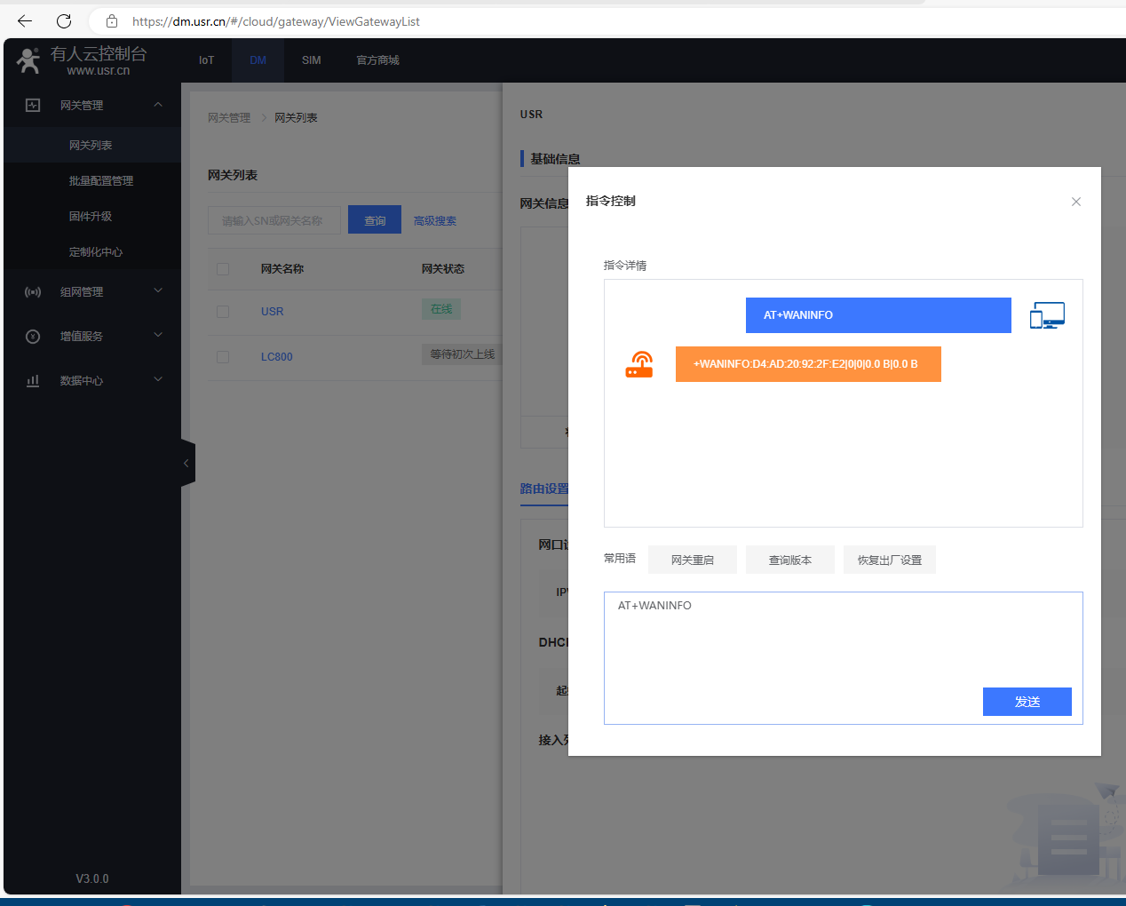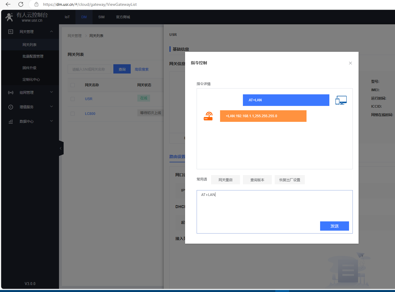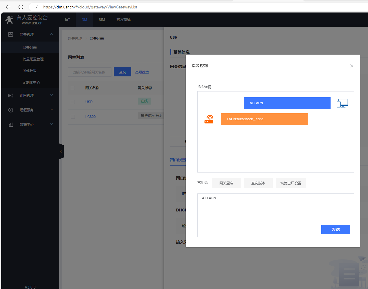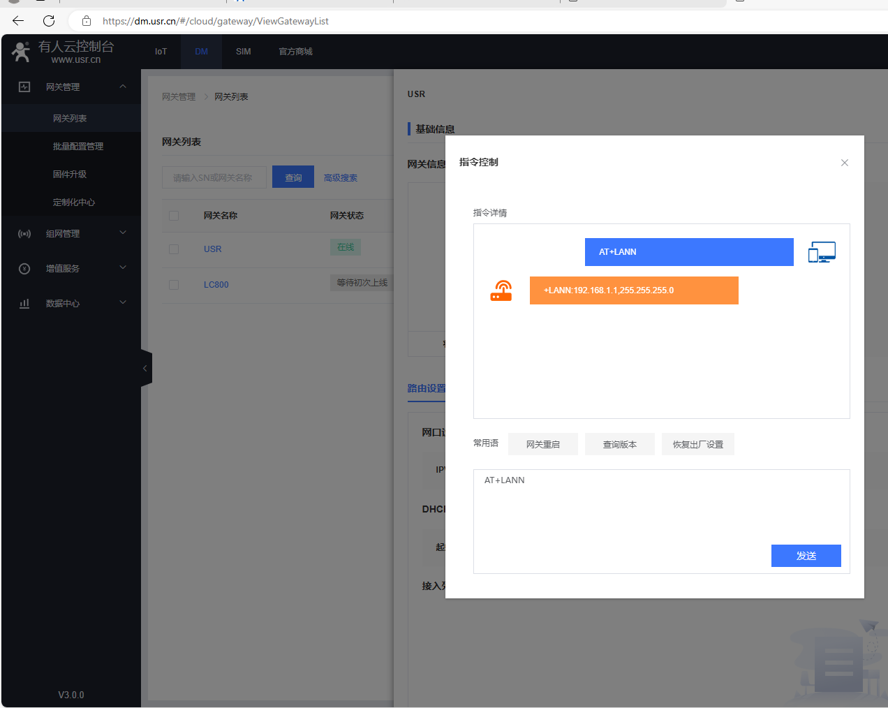在指令控制彈框,發送AT+R重啟USR-G806w的AT指令,網關重啟。