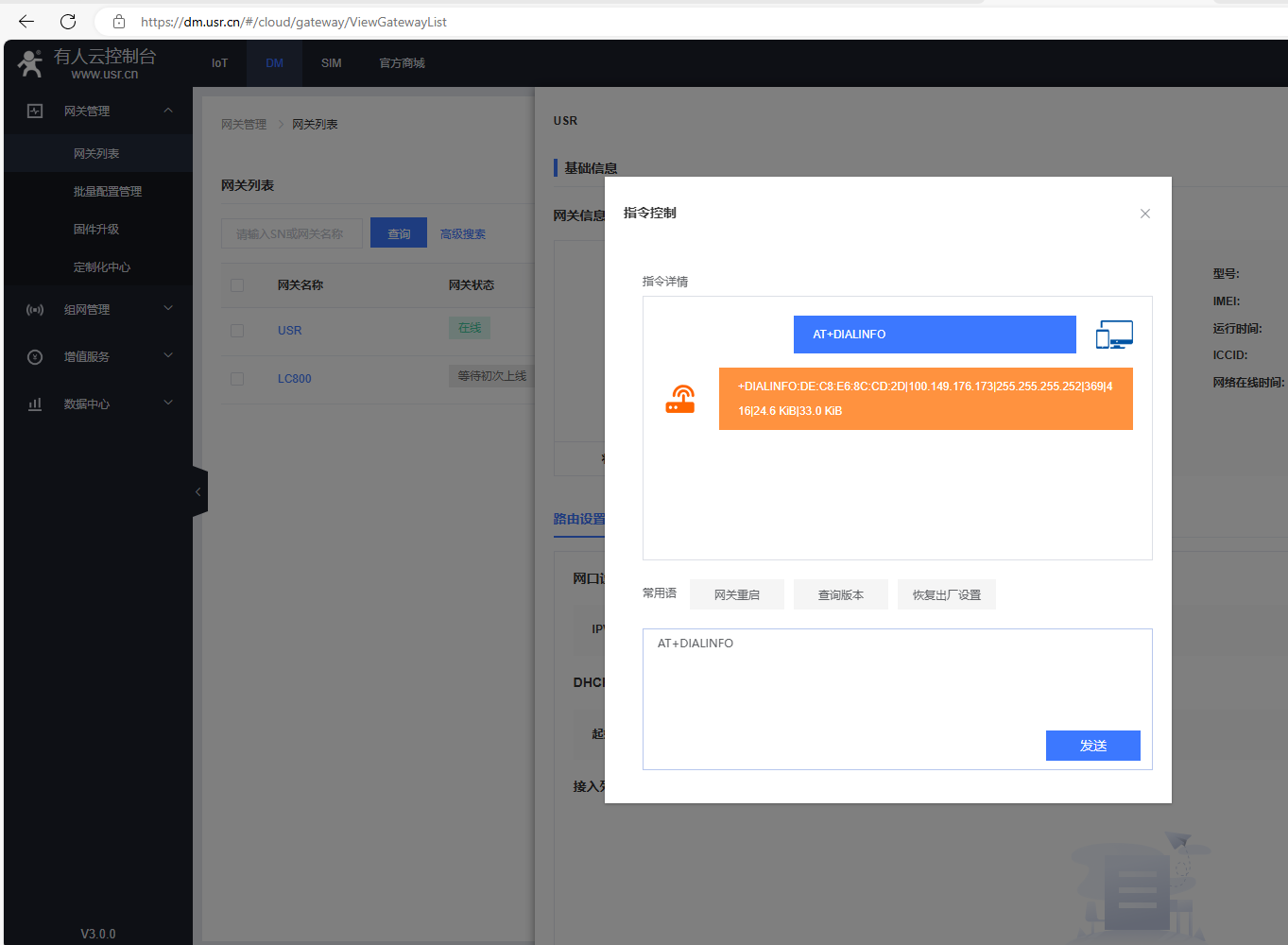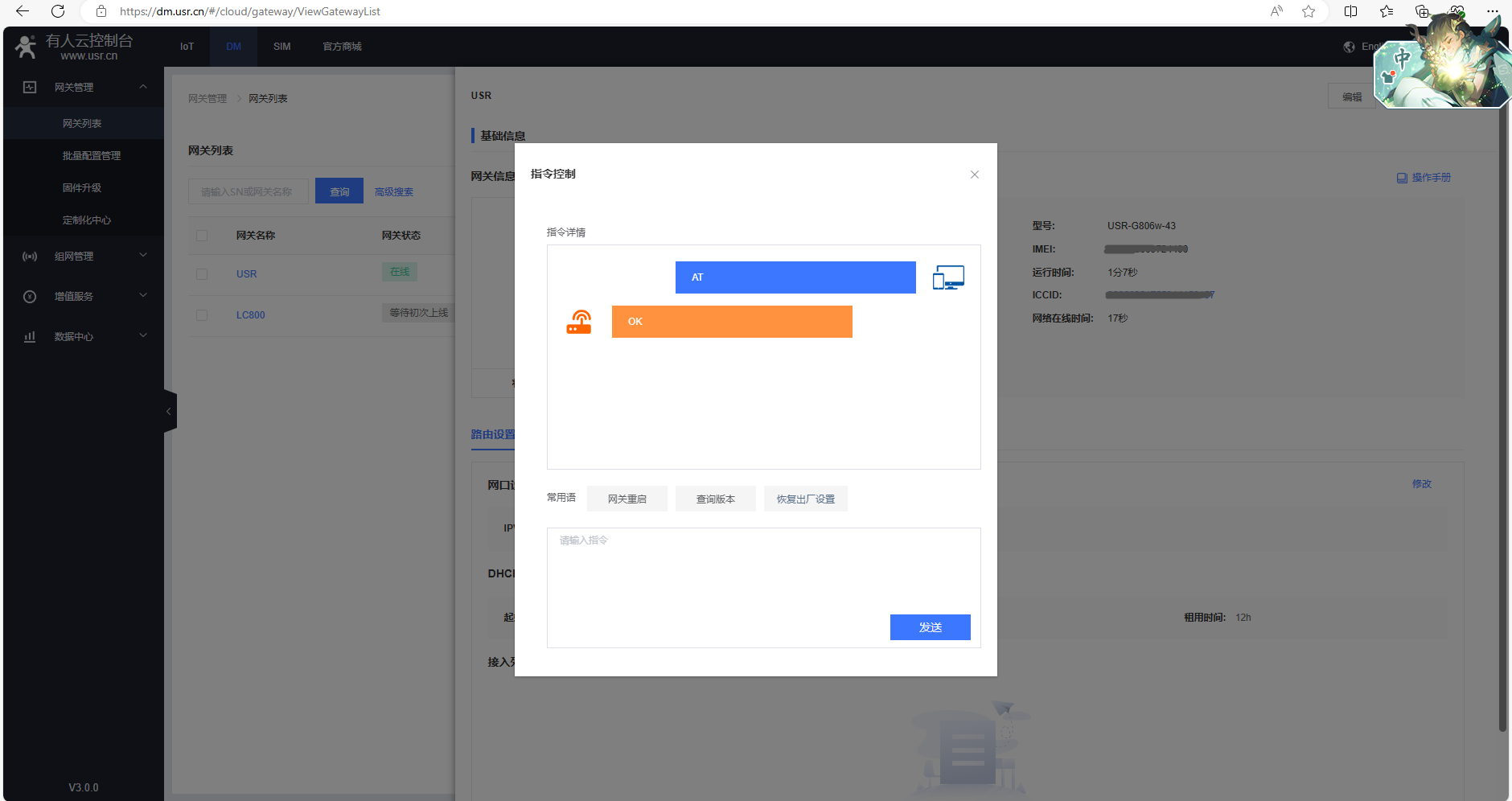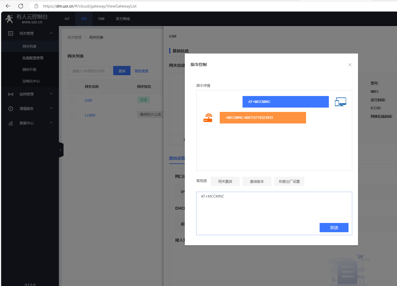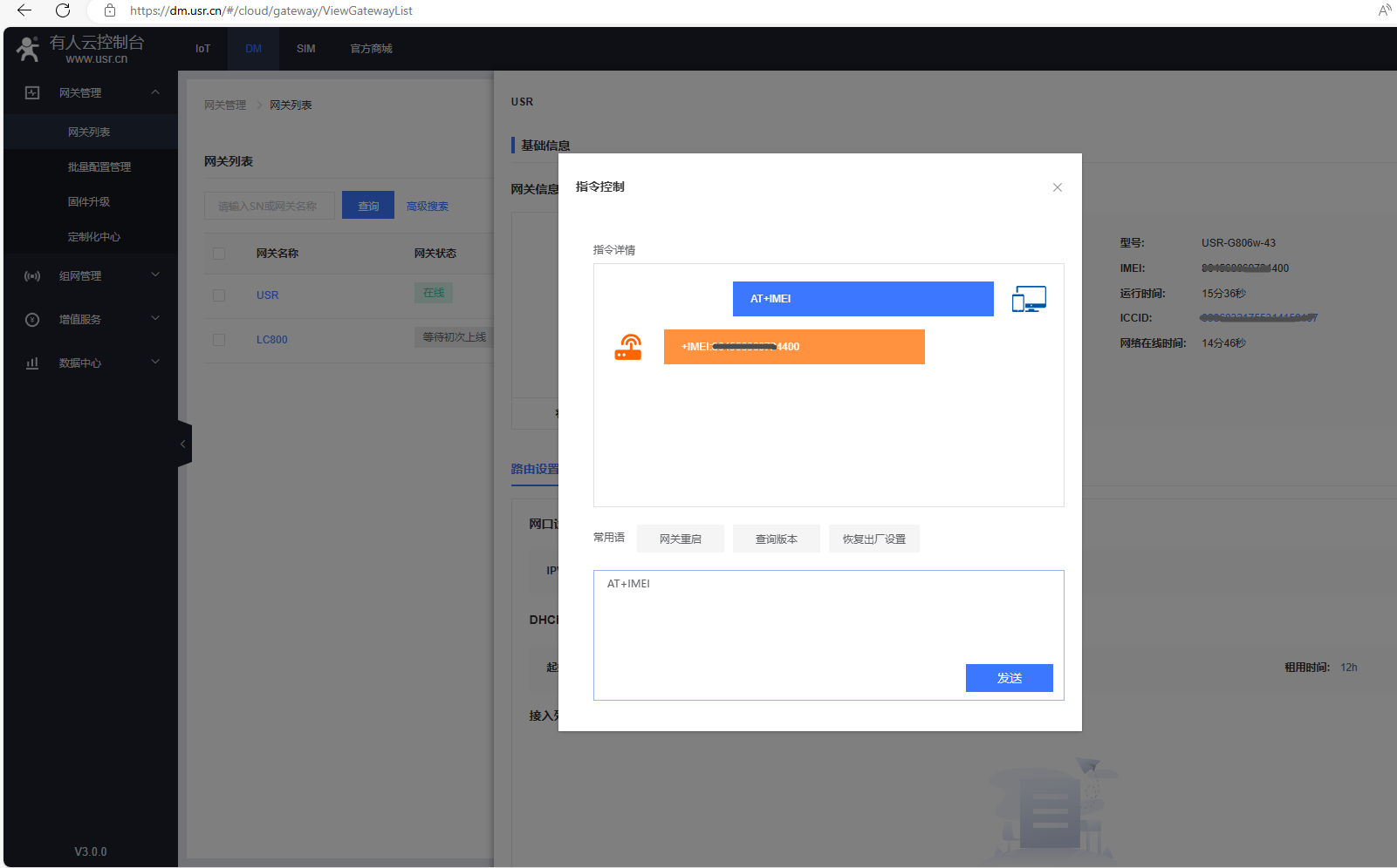 在指令控制彈框,發送AT+R重啟USR-G806w的AT指令,網關重啟。