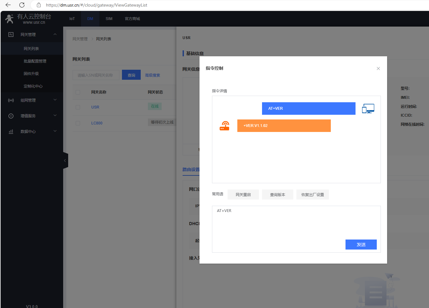 在指令控制彈框,發送AT+VER,去查詢固件版本號。