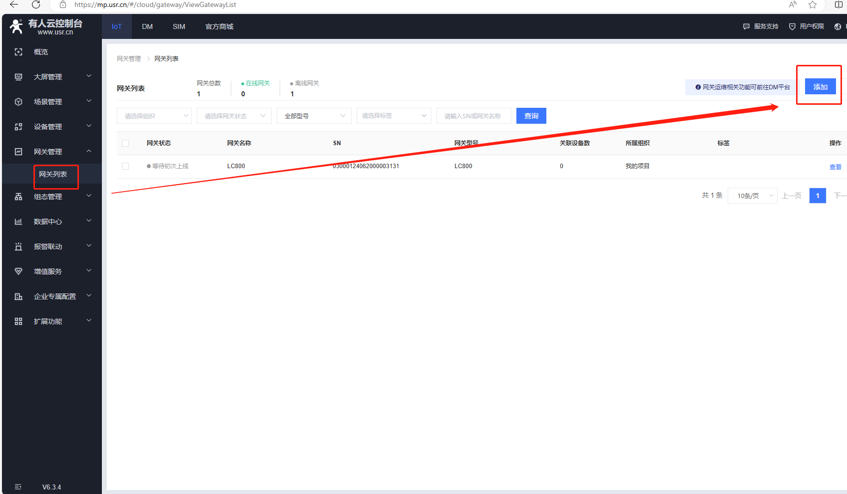 (1)IOT平臺,點擊網關管理,點擊網關列表,點擊添加。