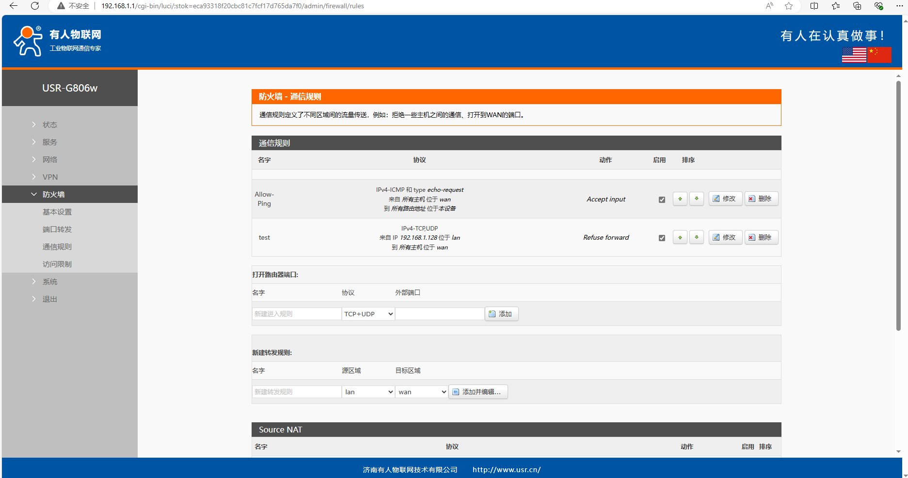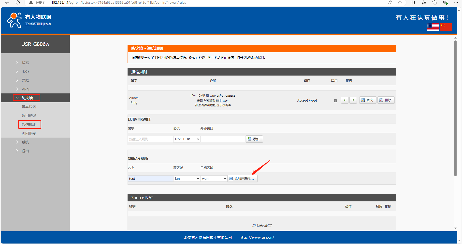 (1)手機連接USR-G806w的WiFi,網頁點擊防火墻,點擊通信規則,首先在新建轉發規則中輸入規則的名字,然后點擊“添加并編輯”按鈕,如下圖: