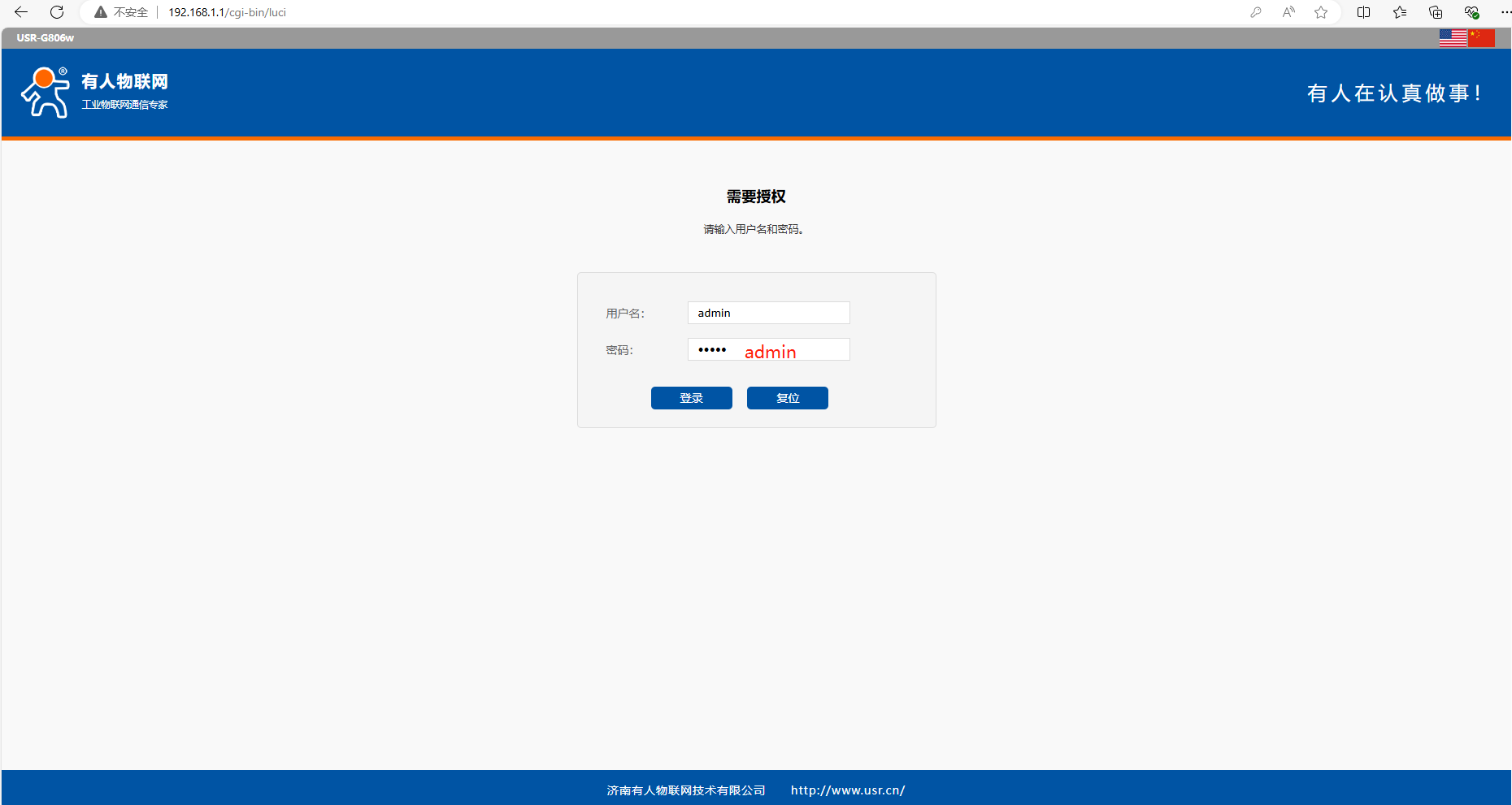 電腦連接USR-G806w的WiFi,瀏覽器輸入USR-G806w的IP,192.168.1.1,用戶名和密碼都是admin。