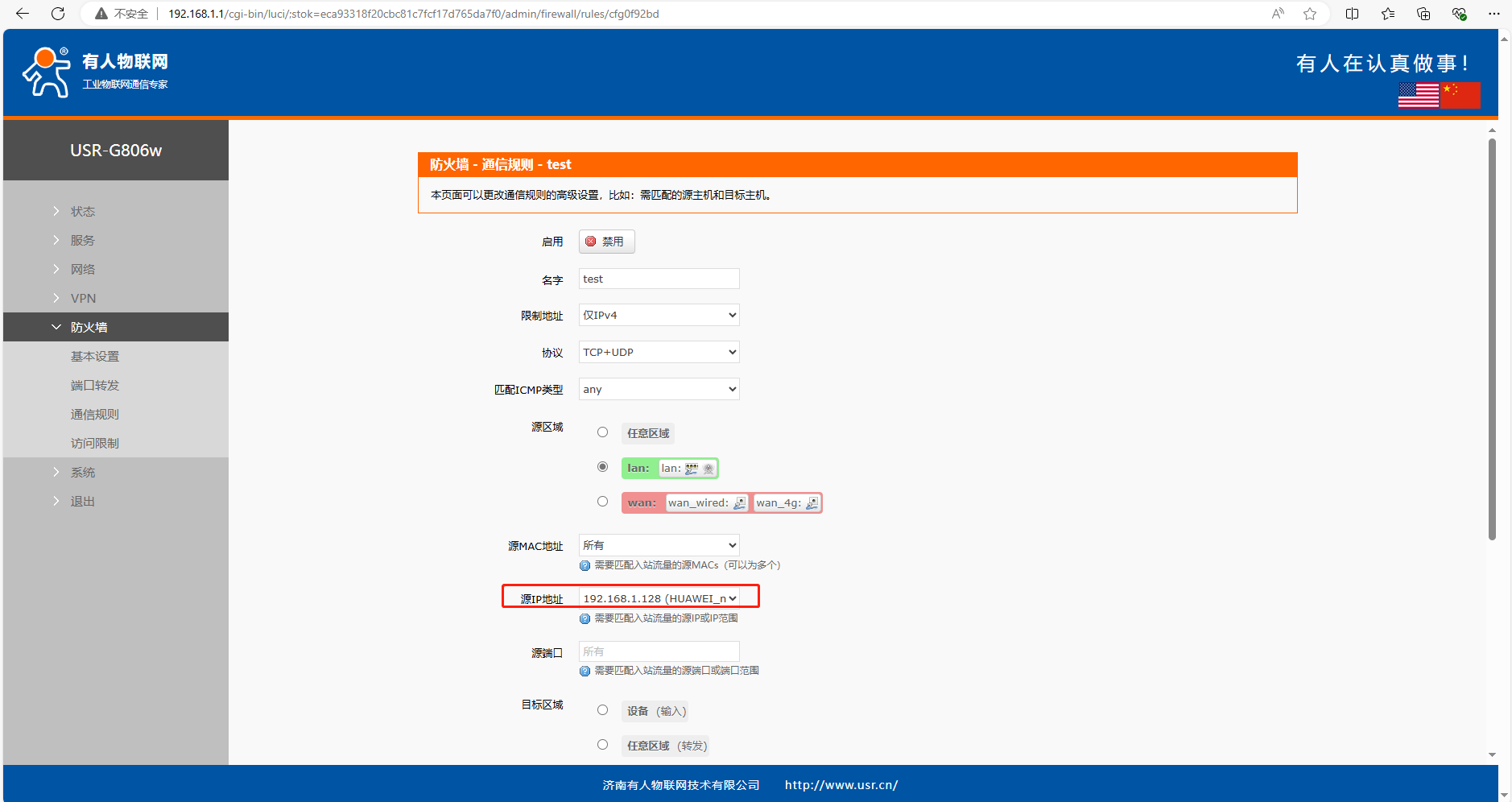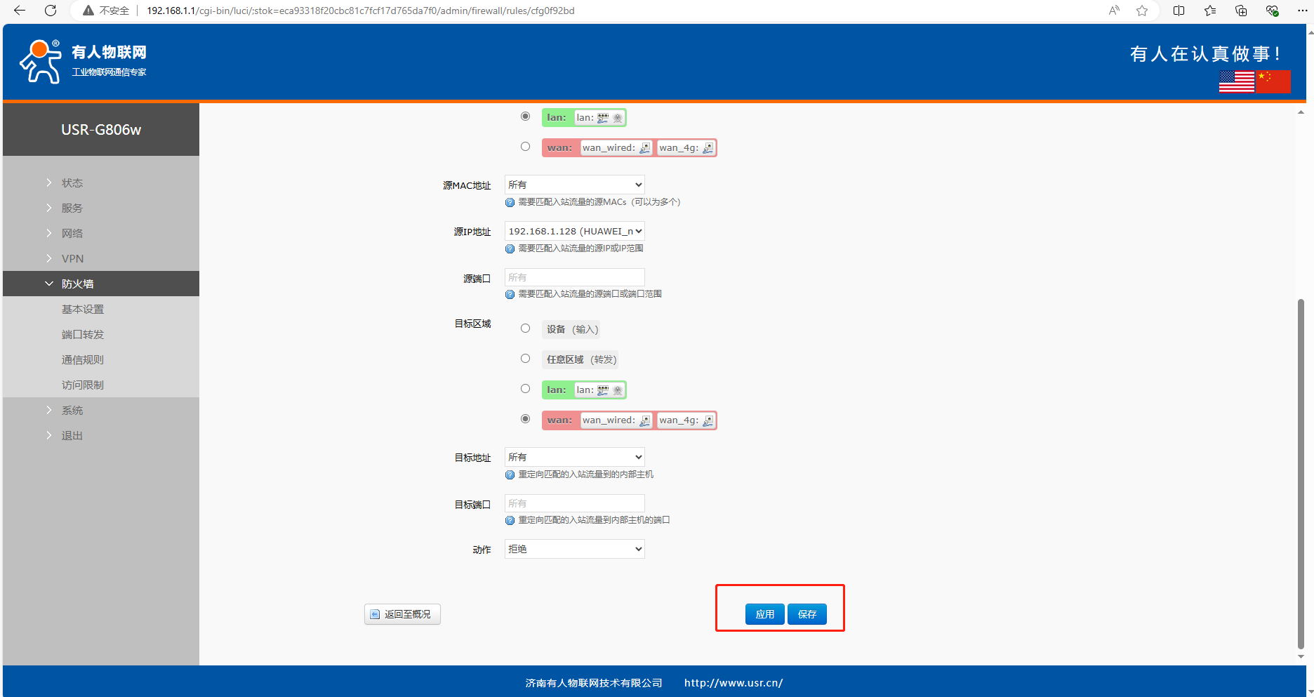 (2)源IP地址,選擇手機連接USR-G806w WiFi獲取的IP地址,動作選擇拒絕。點擊應用。