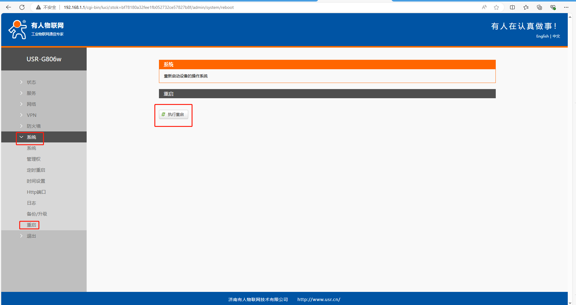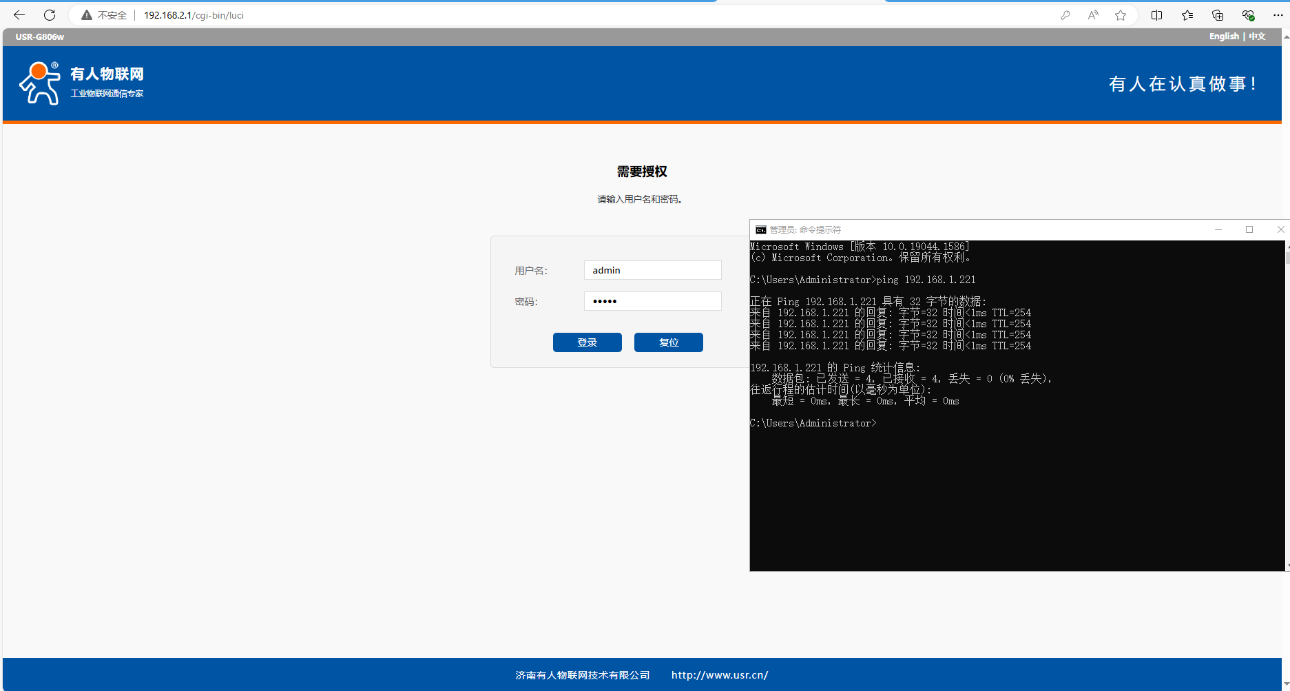 第一臺電腦的網(wǎng)口用網(wǎng)線連接USR-G806w的LAN1,瀏覽器輸入USR-G806w的IP,192.168.1.1,用戶名和密碼都是admin。