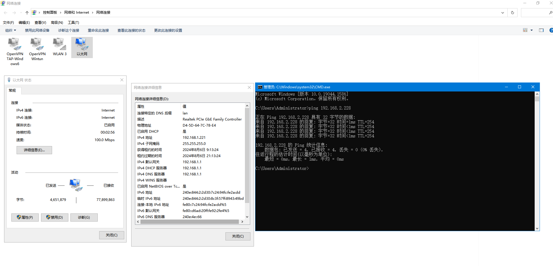 1、第一臺電腦接USR-G806w的LAN1, 電腦獲取的IP是192.168.1.221。第二臺電腦接USR-G806w的LAN2,電腦獲取的IP是192.168.2.228。